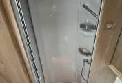 mixer tap and 3 gas burner hob with ample storage underneath. The heating, hot water & fridge can be run off 12v, 240v hook up & gas. Opposite is a