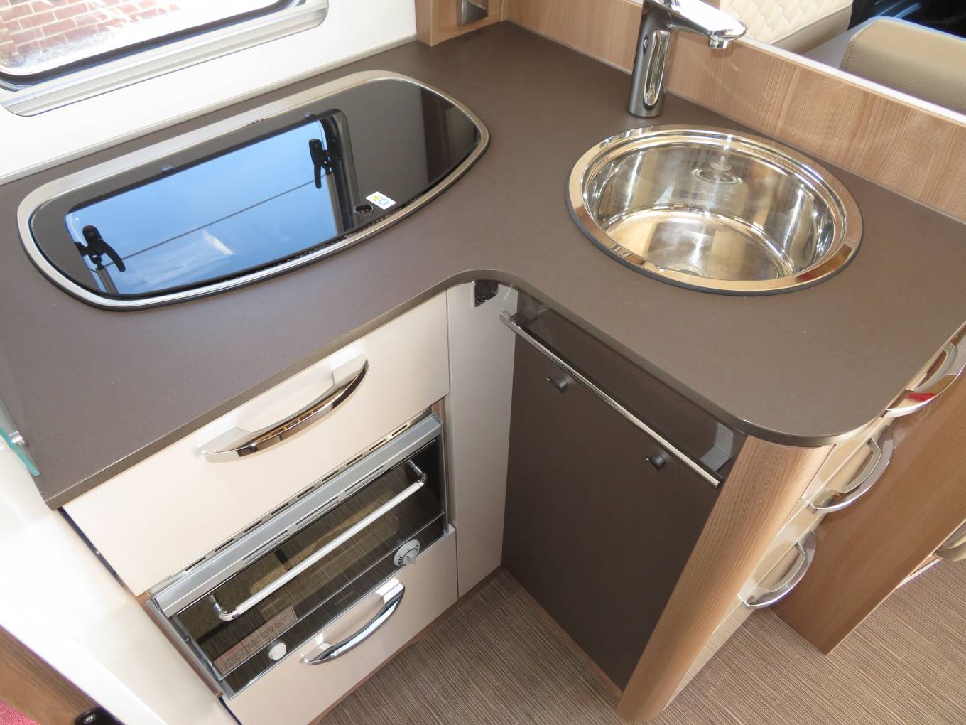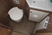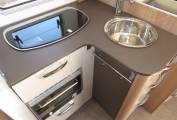 At the front of the motorhome you have a fabulous seating and dining area. The captains chairs turn round to create the perfect space if you are eating in or entertaining friends. The Burstner comes with a well equipped kitchen area that includes oven, grill, hob with 3 gas burners, microwave oven, 3-way large fridge with freezer compartment and sink with mixer tap. The motorhome comes with plenty of cupboard and storage space for all your cooking utensils and ingredients.