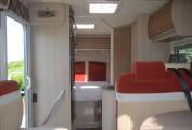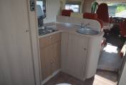 Moving forward the kitchen area has a 3 burner gas hob, oven, grill, sink and a 3 way fridge freezer. The lounge is comfortable with seating surrounding the table. Above the lounge there is a drop down bed for 2 people. Cab has 2 captains chairs, cruise control, cab air con, driver and passengers air bag, radio, electric mirrors and the motorhome is painted in champagne and black metallic paint.