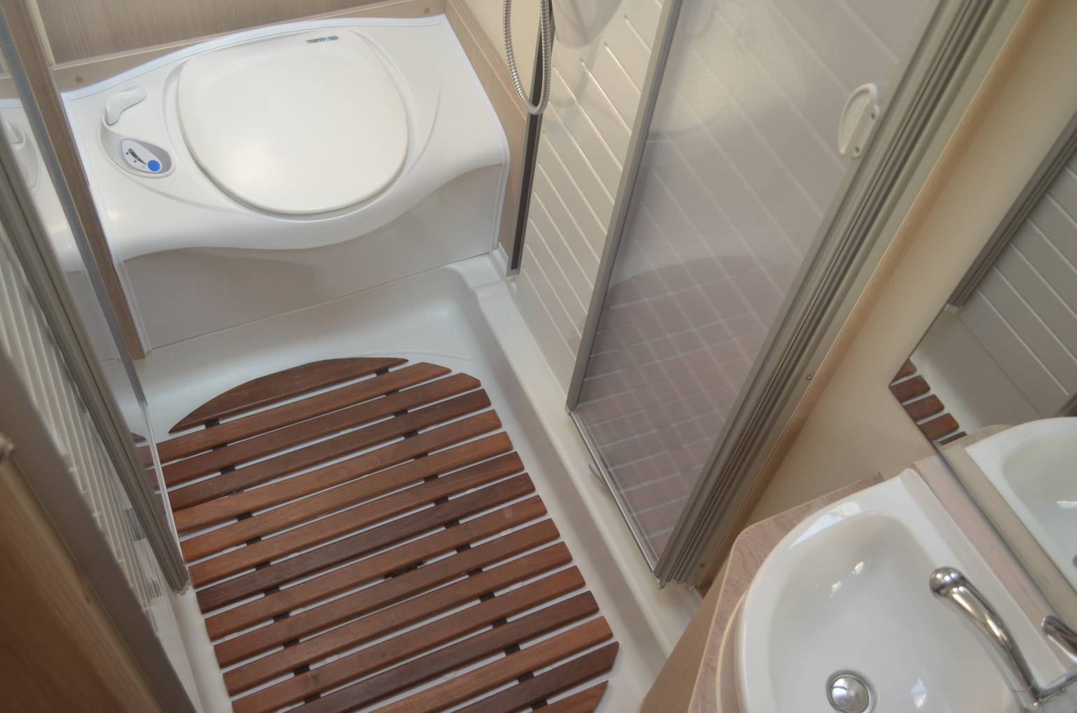 Presented in great condition with 4 travelling seat belts and sleeping places for 4 people. At the rear you have a french bed with storage space below. En suite bathroom is spacious and has a shower, wash hand basin and a cassette toilet.