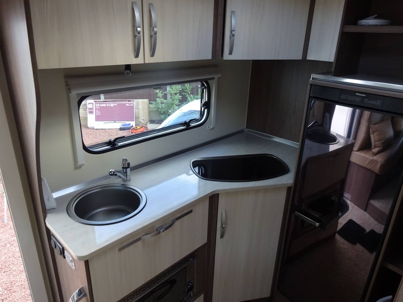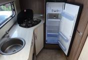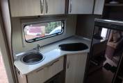 Above the Lounge is an Electric Drop Down Bed, which disappears in the day time leaving a great living space. The Kitchen features a full sized 3 way fridge freezer, a 3 burner gas hob, electric oven and grill and generous work space.