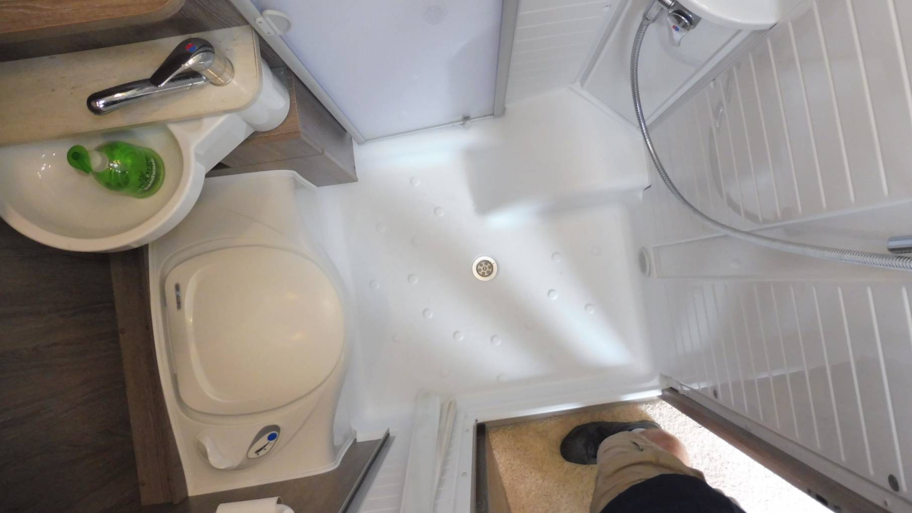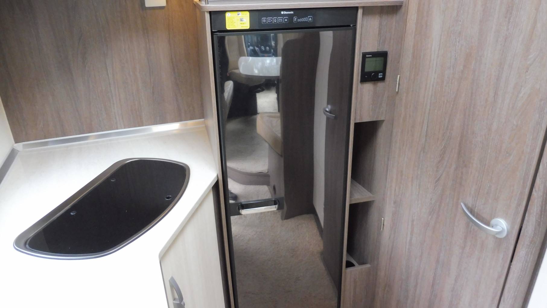 At the rear of the van there is a corner kitchen with 3-burner hob, combination oven and large fridge freezer. Opposite which sits a well-sized washroom with rotating sink, cassette toilet and shower with cubicle door to keep the toilet seat dry.