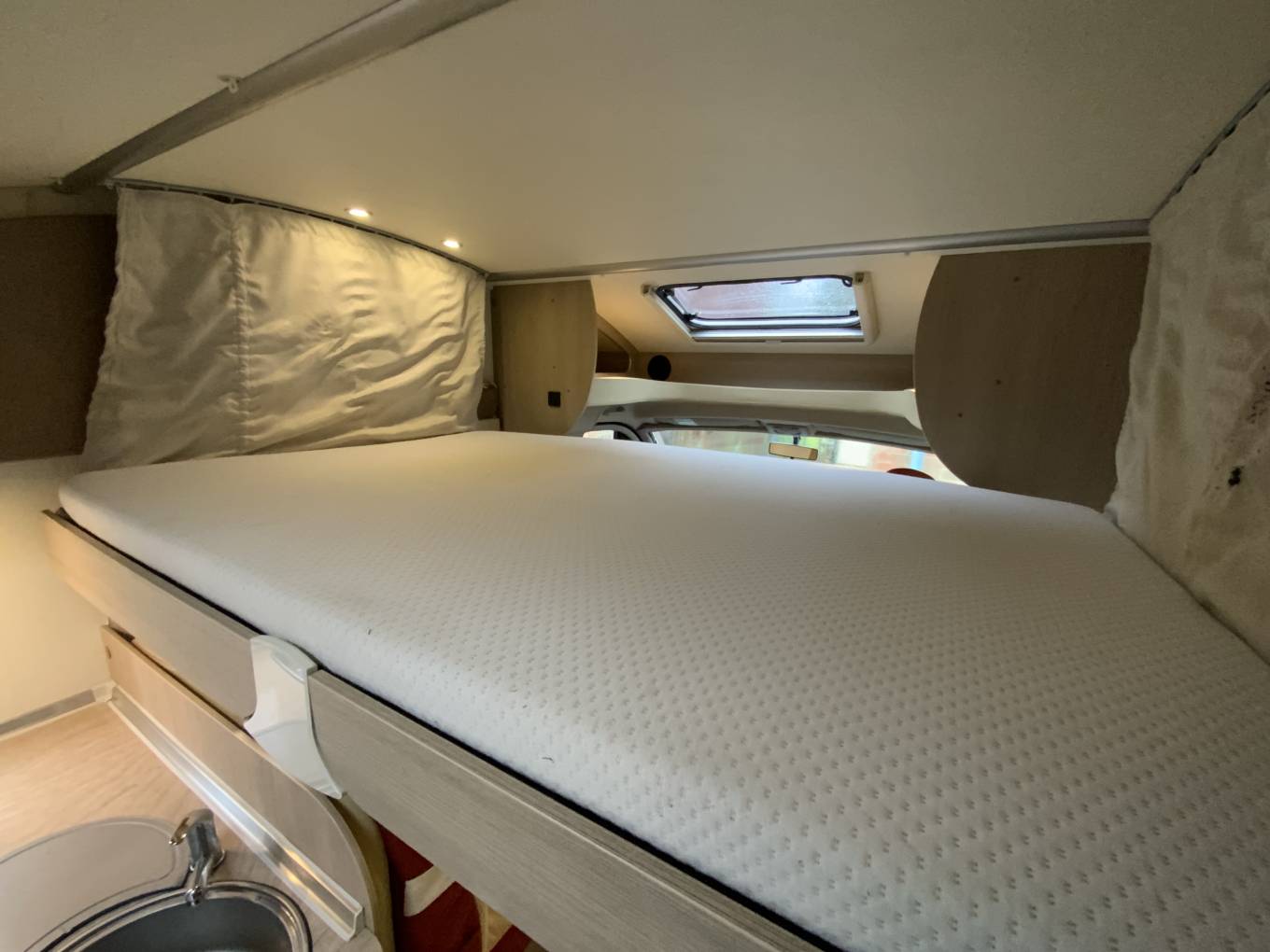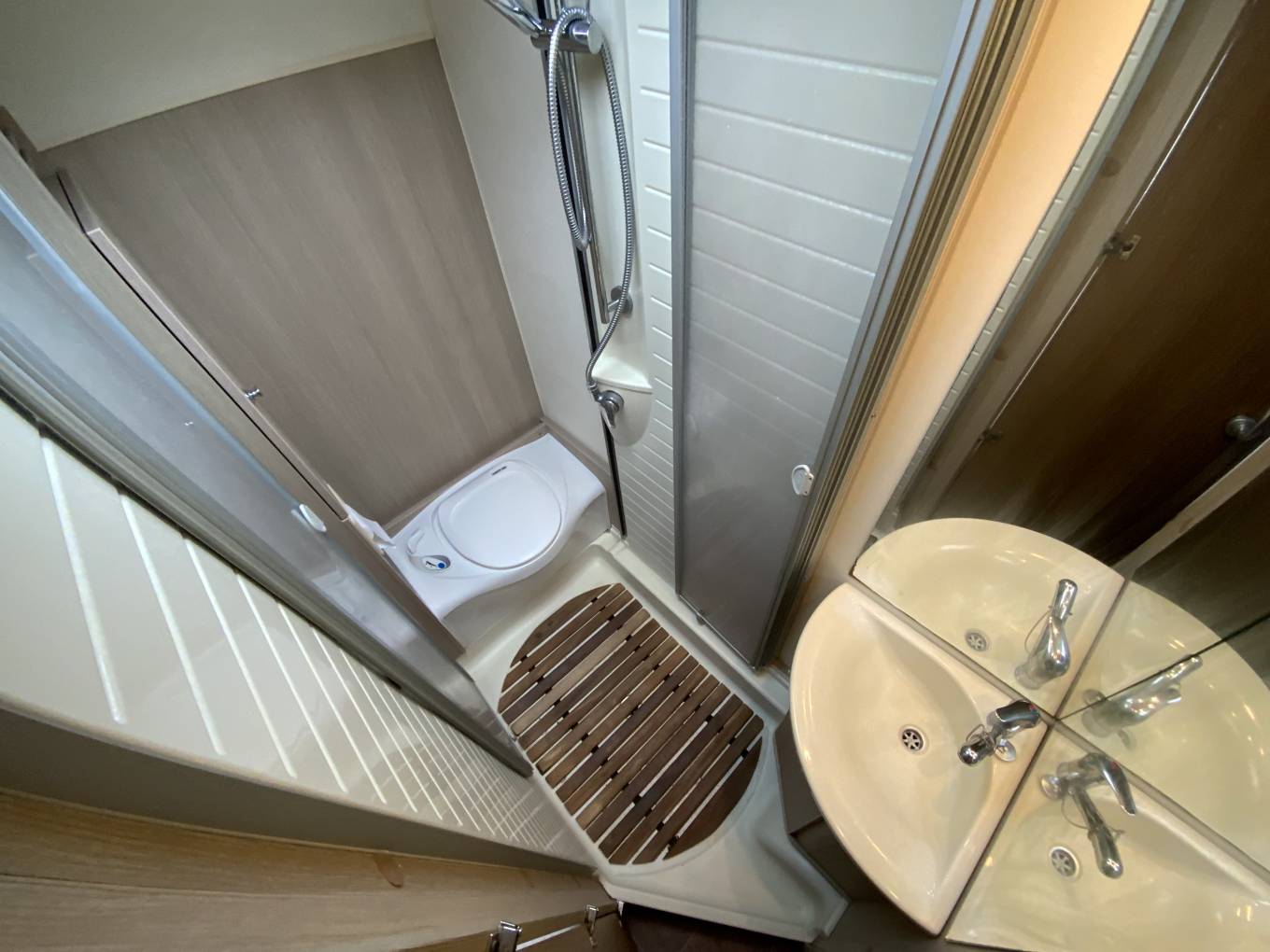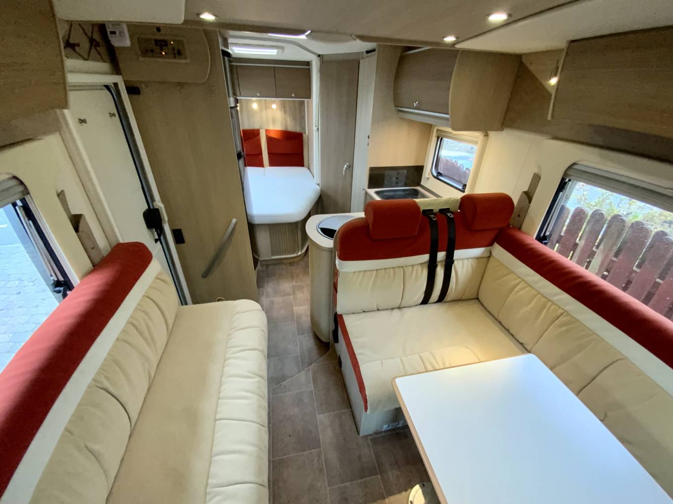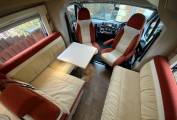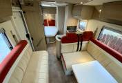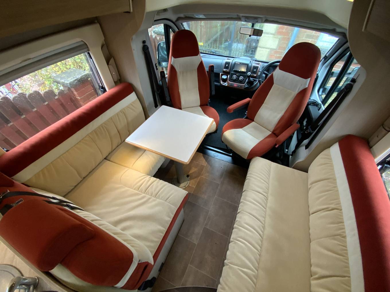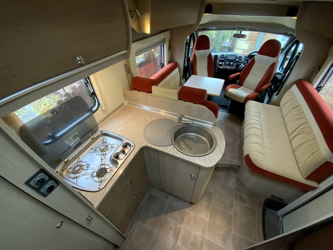 Starting at the rear of the vehicle there is an offset double bed opposite a well equipped washroom that is generously proportioned, it features a cassette toilet, hand basin and separate shower cubicle. Moving to the centre of the vehicle we have a well equipped kitchen with tec tower which features a fridge freezer and oven and grill combination opposite a sink and hob over plenty of storage. At the front of the vehicle we have a good sized dining and lounge area that can easily seat 6 by utilising the two swivel front seats, this dining area also features two additional travel seats. Above the dining area is a manual drop down bed that can sleep two adults.