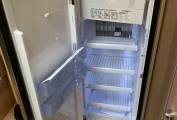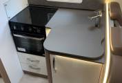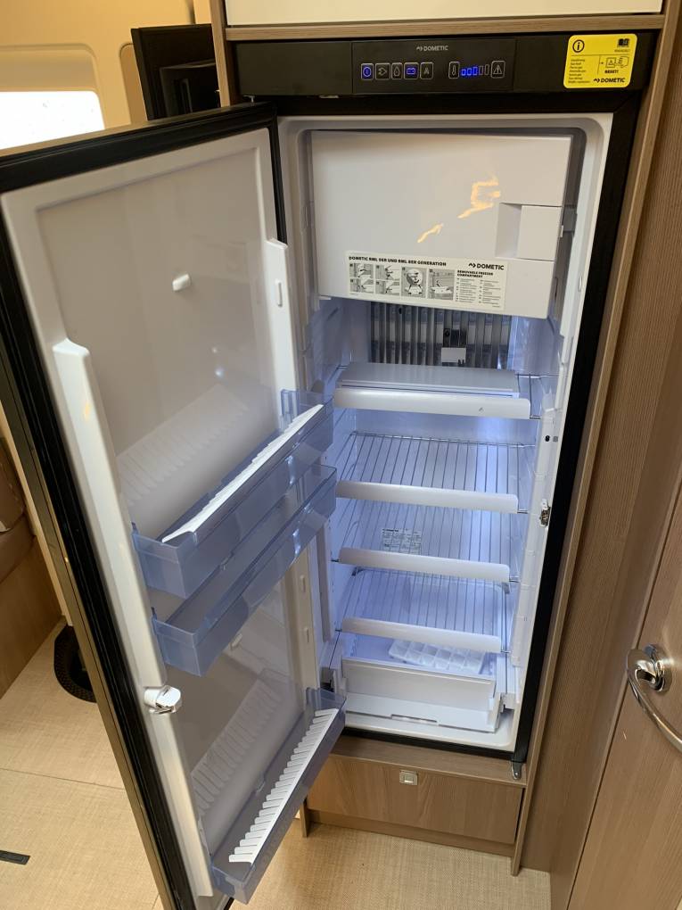 Moving through to the centre of the motorhome to the kitchen area where there is a Thetford oven which includes a 3 ring gas hob supplied from the gas bottles located in the exterior storage unit. Next to the cooker is the sink with a slide our aadditional worktop area. Opposite this, is the large full height Dometic fridge with freezer compartment with storage cupboards underneath and overhead.