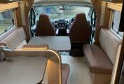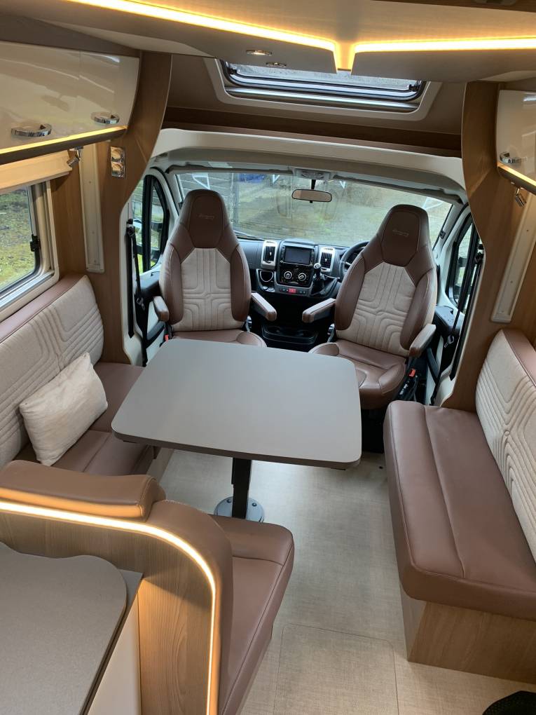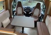 heading towards the front of the motorhome is the incredibly spacious central dinette which is flooded with natural light by day and warm ambient lighting by night making it a fabulous spot to relax and unwind in no matter what time of the day. There is a small L shape sofa down one side which boasts the rear 2 travelling seats and adjacent is a 2 seater sofa. In between is a large dining table for all the family to enjoy. These seats convert to a double bed.