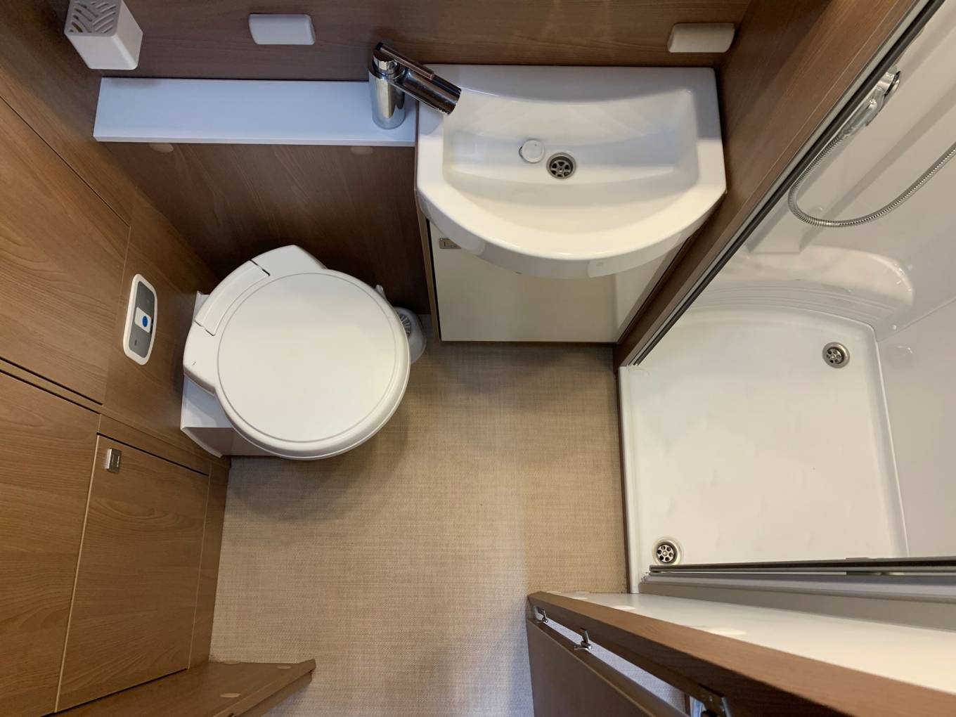 Starting with the rear of the motorhome, you have a large bathroom which includes a sink with cupboards, toilet and a separate full length shower. There is also a large wardrobe which can also be accessed by the exterior door which is also classed as a ski locker.