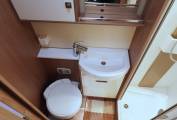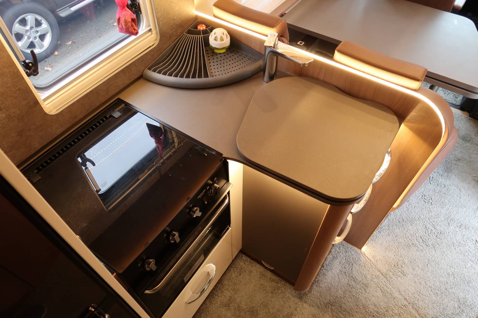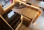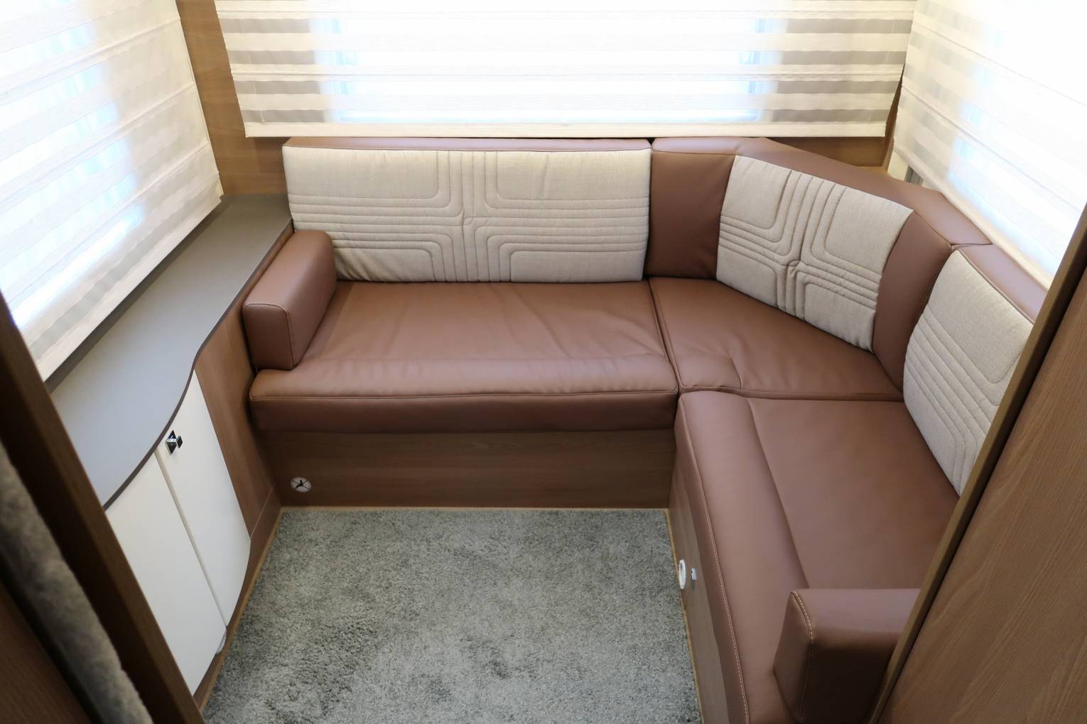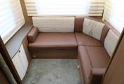 The layout comprises of an L shape end lounge with triple aspect windows and a TV/DVD player. You have a mid-kitchen comprising of a gas oven and grill, a 3 gas burner hob, a full size fridge freezer with auto selection, a stainless steel sink with a mixer tap, an extension leaf for food preparation and a roof extractor fan. There are numerous drawers for your cookware and ingredients so if you enjoy cooking you will love this kitchen. Opposite the kitchen is the bathroom featuring a separate shower with a perspex screen, a wash basin with mixer tap, a cassette toilet with electric flush, 2 bathroom storage cupboards, a large mirror and a roof vent.