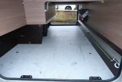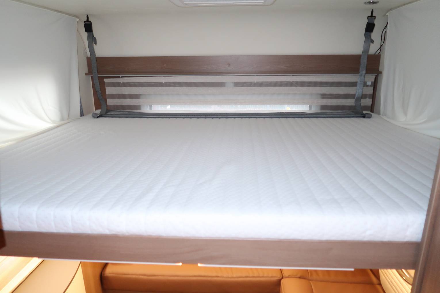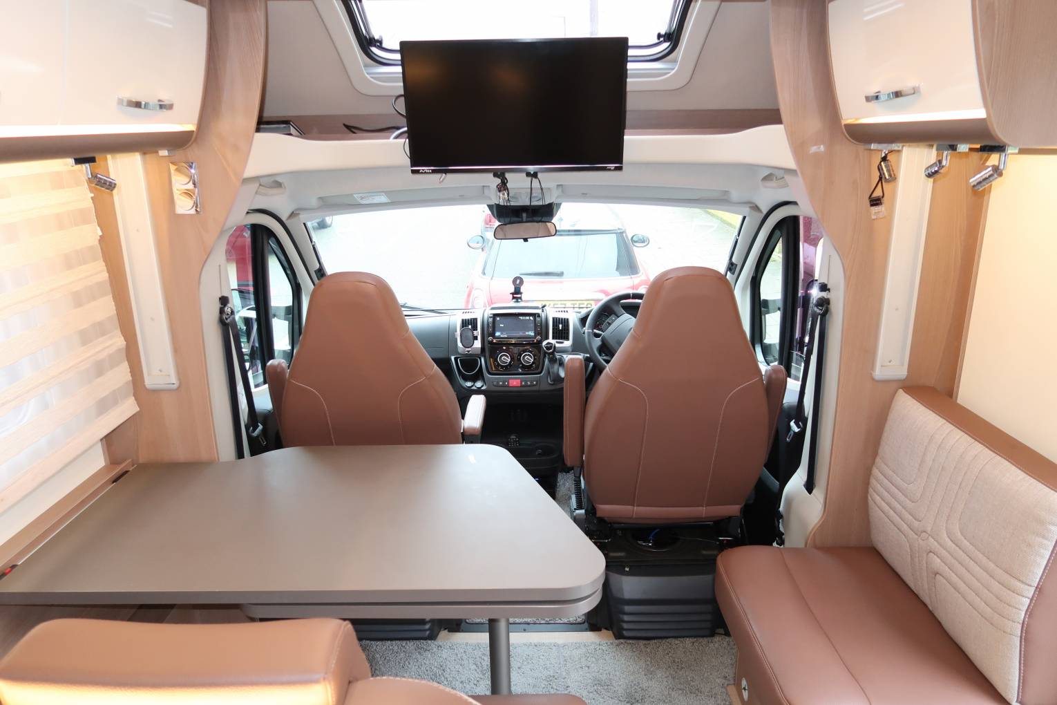 The lounge dinette has a forward facing two seater sofa fitted with two seat belts and an extending dining table that is mounted to a side rail which can be removed to create more space. There is also a single side facing seat. Above the cab is a TV so this is an ideal spot for the kids to relax in. In the cab the driver has an automatic gearbox, cruise control, a reversing camera, sat nav, cab air con, a multi-media system and much more.