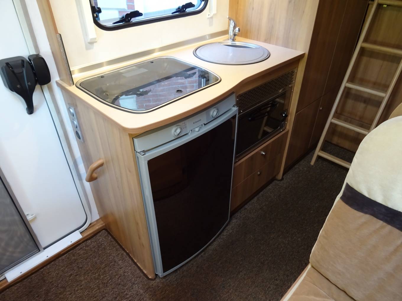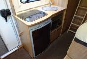 of a 3 burner gas hob, a chrome sink with mixer tap, a 3 way Dometic fridge,