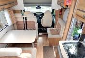 We enter the vehicle on the offside via an electric step straight into the dinette which consists of two opposing sofas on the passengers side with 4 X lap & diagonal seat belts facing front and rear. The table is fixed to the wall but will seat 5 people around comfortably for dinner, and also drops down to make this area into a smaller double bed. The driver seat also swivels to join this area & there is also an additional seat to the right of the habitation door.