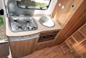 Moving rear is the kitchen which consists of a 3 burner gas hob and a round chrome sink with mixer tap. Below the counter is a 3 way Dometic absorber fridge that can be powered by: 240V, 12V or gas depending on whether you are on site or wild camping. A good size Smev Oven & Grill, plenty of cupboard & drawer space above and below.