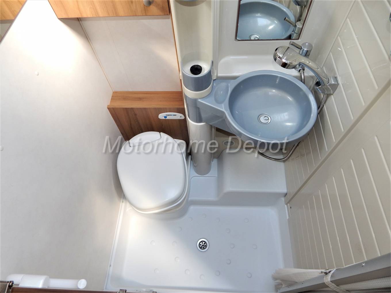 Moving rear again there is a large all in one bathroom. The shower is separated via a curtain to keep the area dry whilst in use. The Toilette a Thetford fresh water flush swivel top with cassette, a wash hand basin above with chrome mixer tap that can be moved while using the shower.