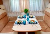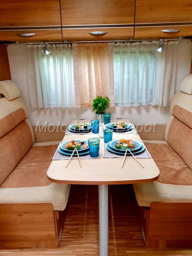 We enter the vehicle on the offside via an electric step straight into the dinette which consists of two opposing sofas on the passengers side with 4 X lap & diagonal seat belts facing front and rear. The table is fixed to the wall but will seat 5 people around comfortably for dinner, and also drops down to make this area into a smaller double bed. The driver seat also swivels to join this area & there is also an additional seat to the right of the habitation door.