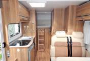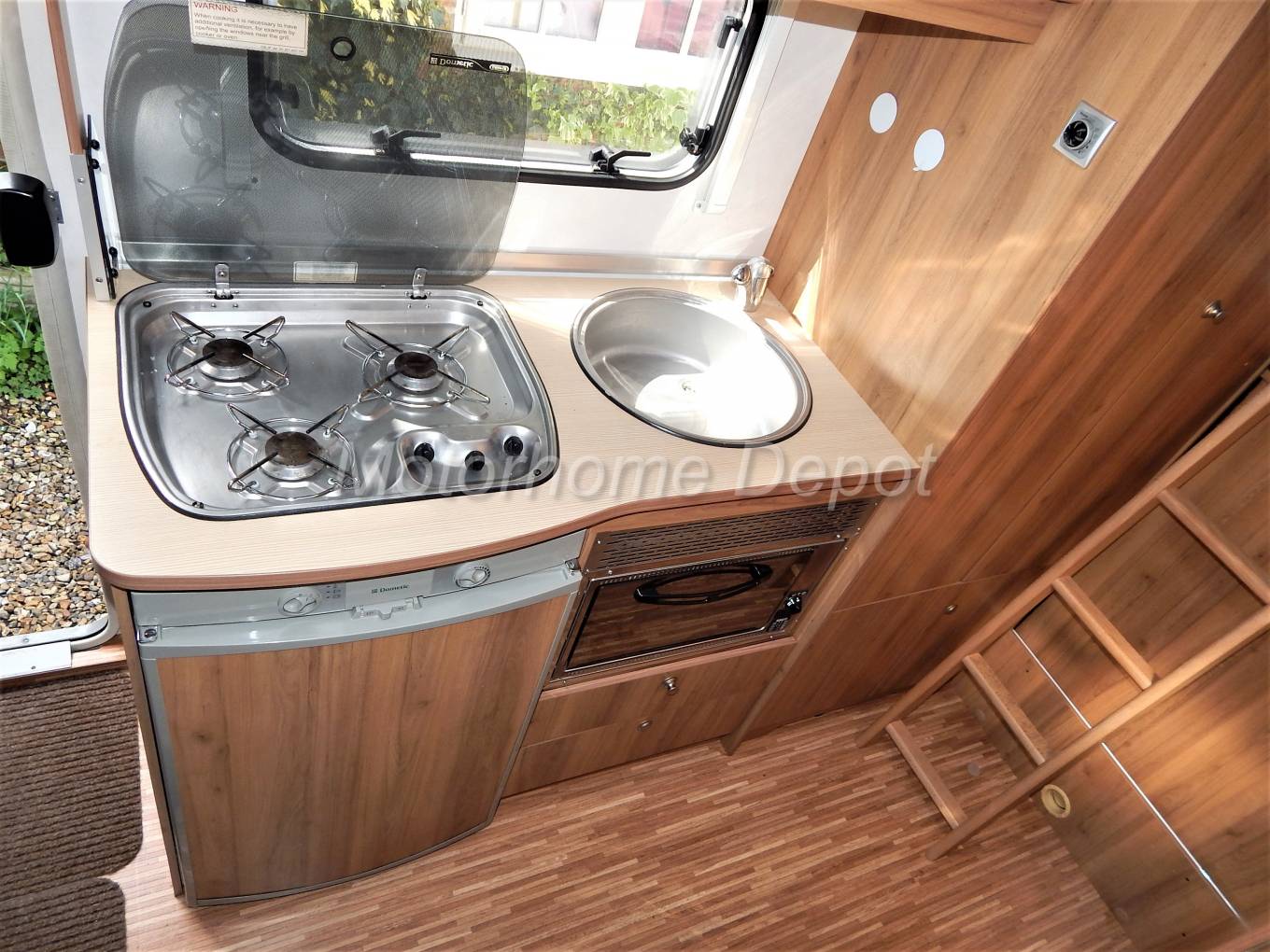 Moving rear is the kitchen which consists of a 3 burner gas hob and a round chrome sink with mixer tap. Below the counter is a 3 way Dometic absorber fridge that can be powered by: 240V, 12V or gas depending on whether you are on site or wild camping. A good size Smev Oven & Grill, plenty of cupboard & drawer space above and below.