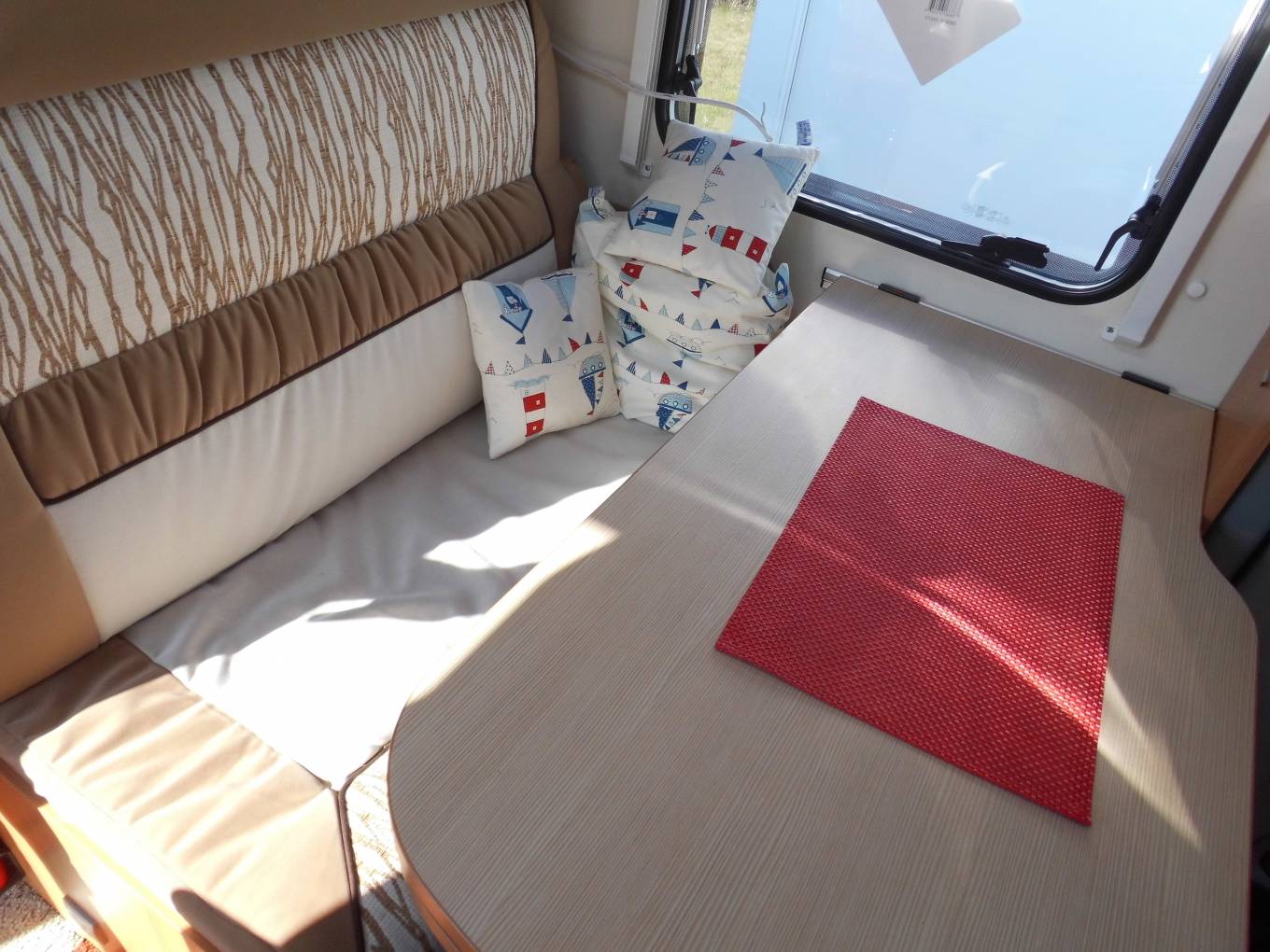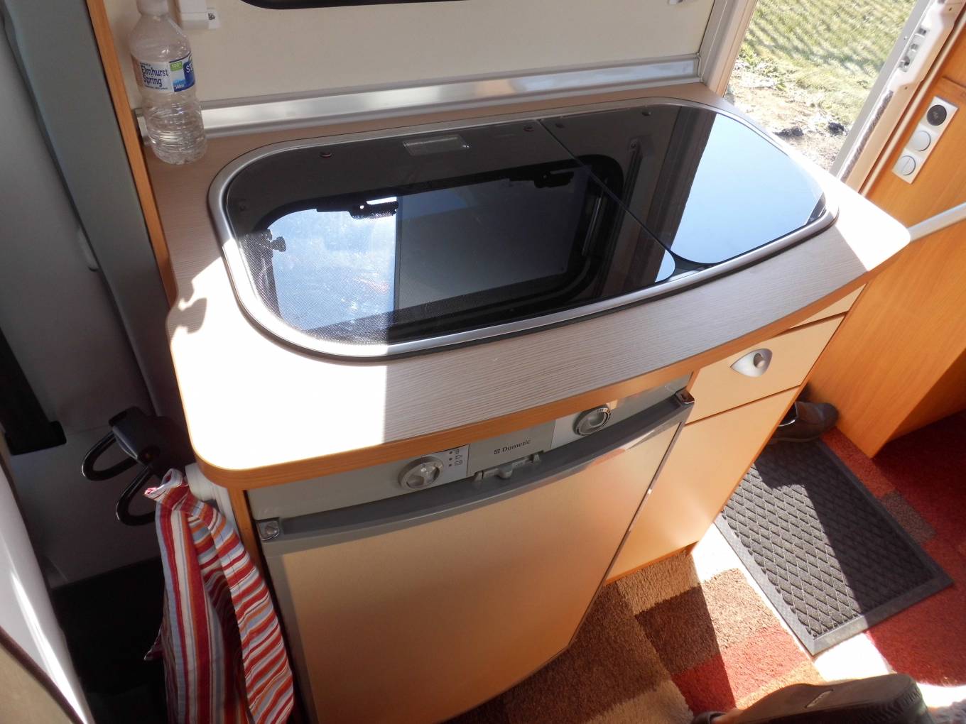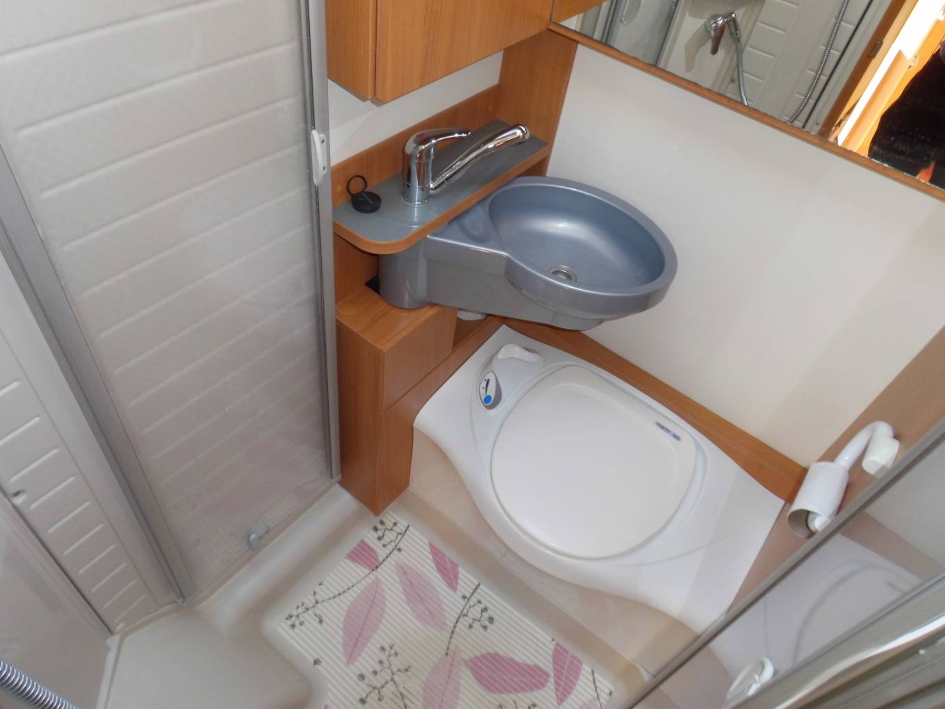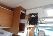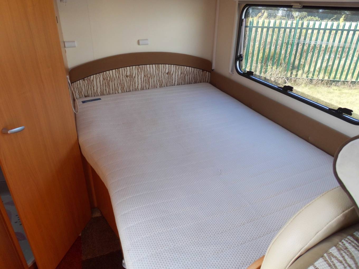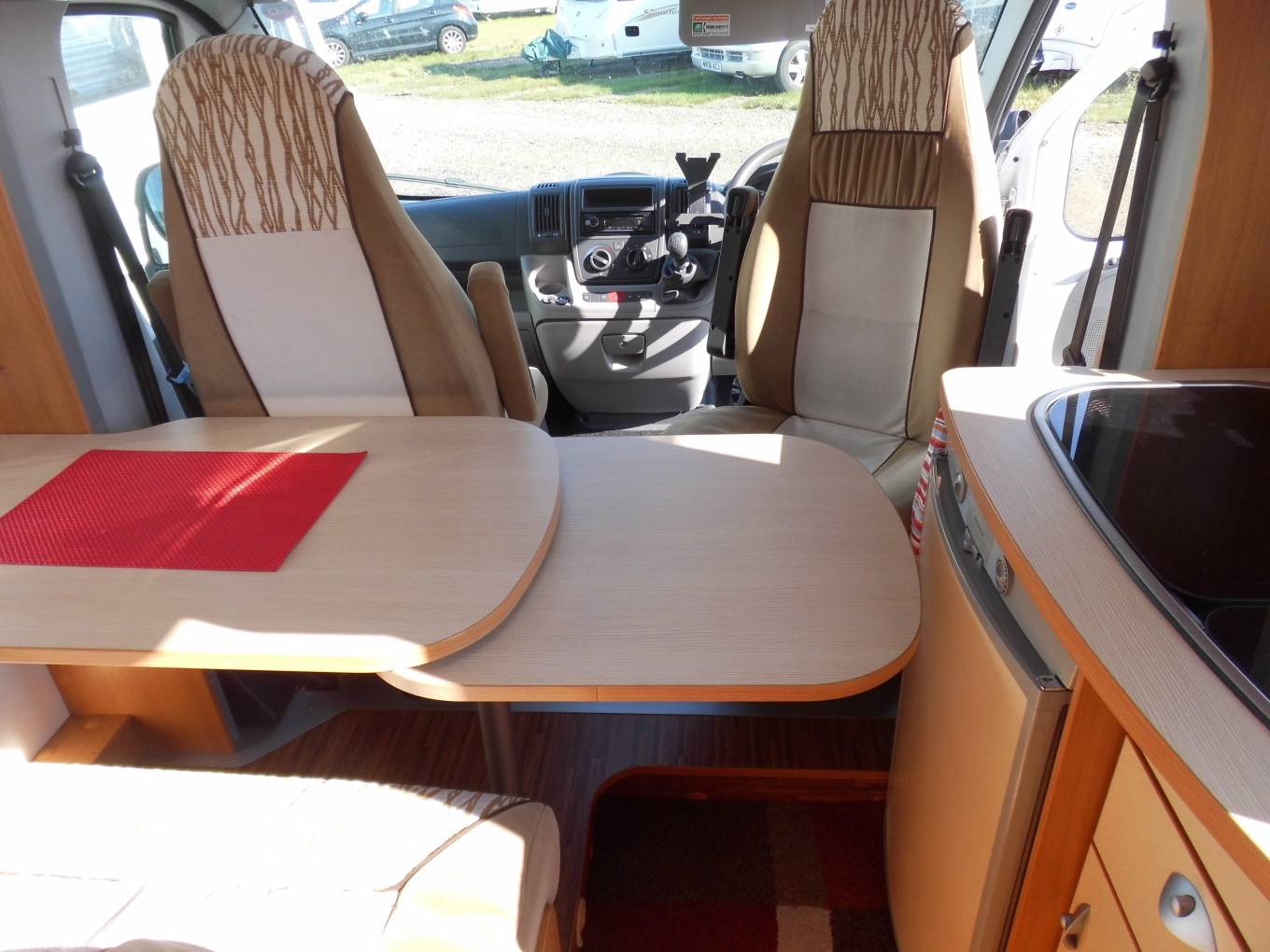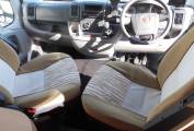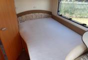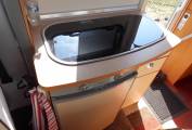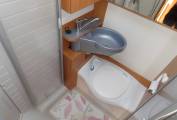 Nice compact 2 berth motorhome with a rear fixed french bed to the left. The half-dinette up front is well-judged for seating comfort. The upholstery is nicely finished, the cushion is soft but supportive and the seatbelt and headrest provision is as good as you’ll get anywhere. With just two of you on board this bench seat and the two swivel cab seats will be enough and there’s an impressive swivelling extension leaf for the table. half dinette is ample for two persons, There’s an integral hob and sink unit, but the hob area is designed so as to double up as a draining board. You get three burners to cook on but the fridge is impressive with its 104-litre capacity. The corner washroom is, of course, alongside the bed and it comes with a pair of bi-fold doors to create a shower cubicle. A bench cassette toilet and swivelling washbasin also feature, along with plenty of room to use all these facilities.