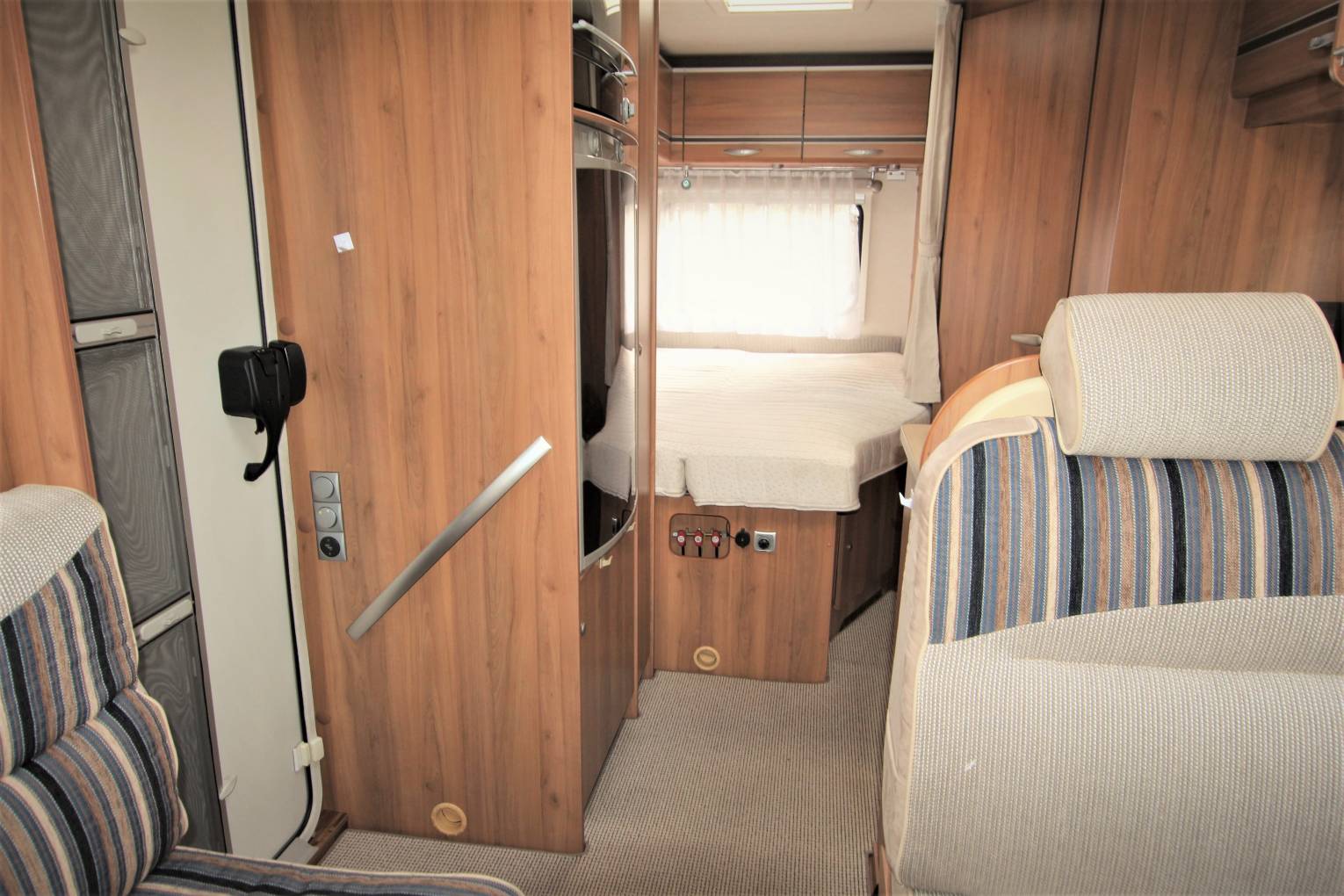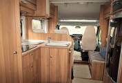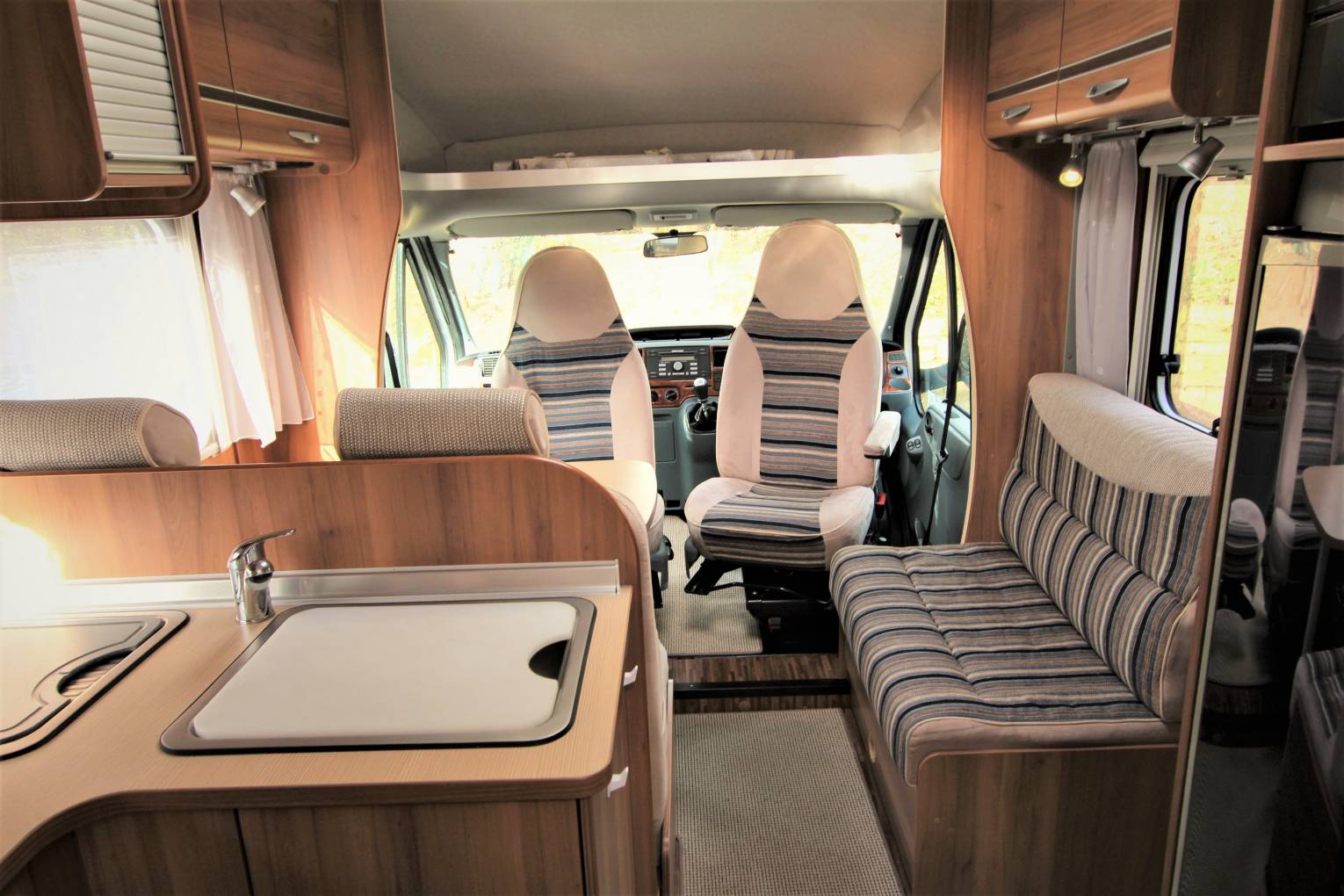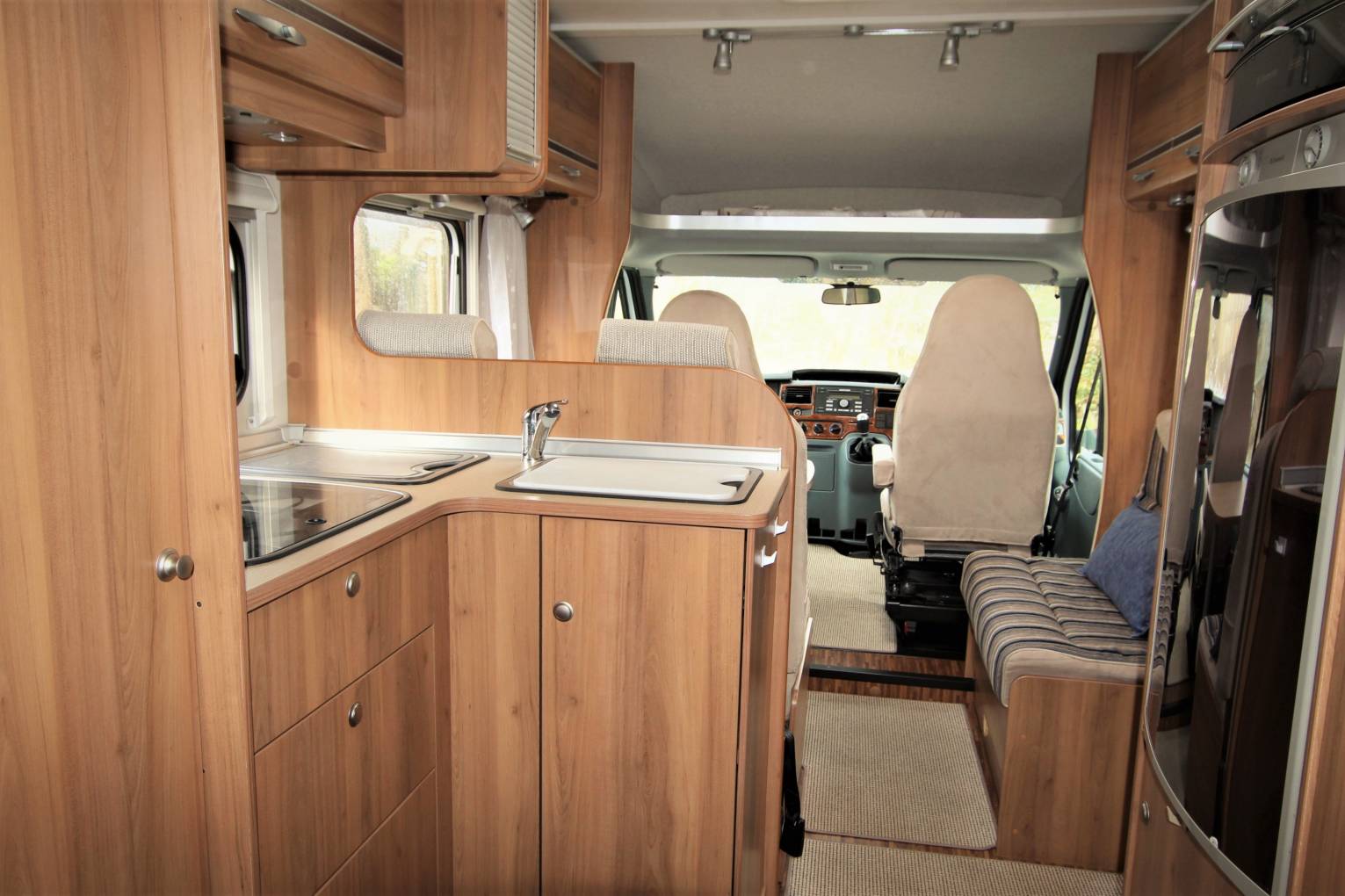 Finished in a light oatmeal upholstery with navy and sand stripes and light walnut effect units this motor home remains in pristine condition as the photographs suggest and has been well looked after.