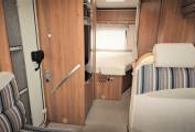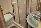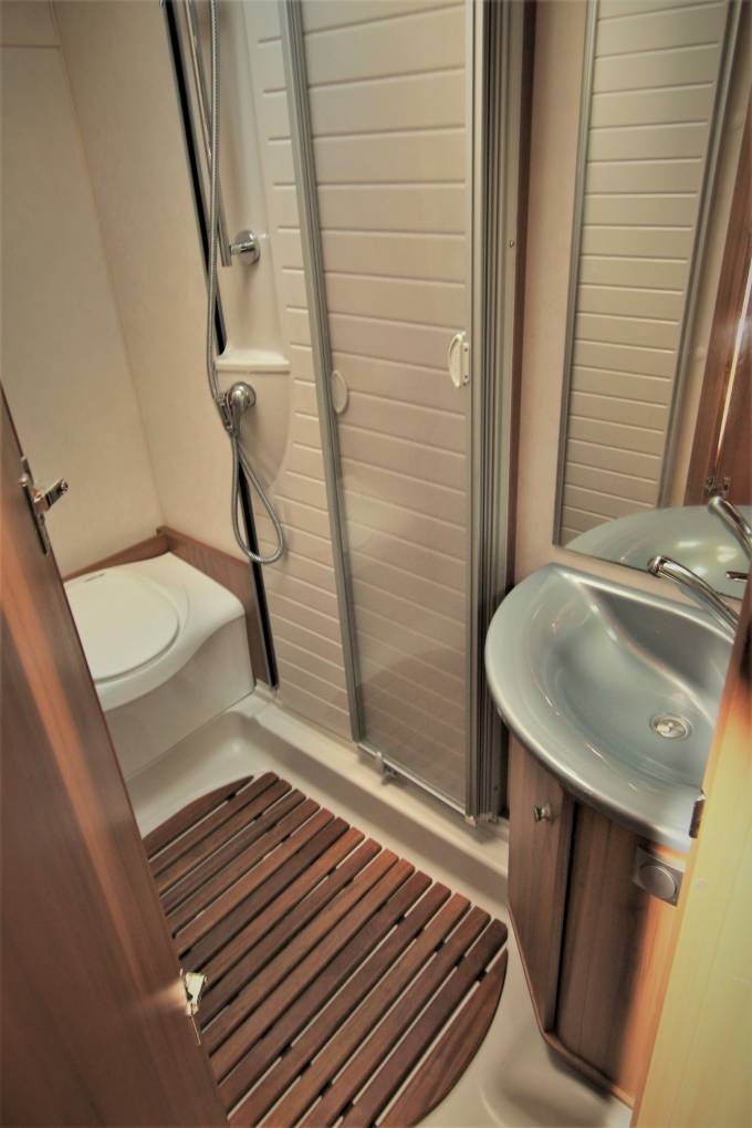 To the rear a fixed double french bed with under bed storage easily accessed from a rear locker or above from the inside by lifting the mattress. A spacious shower and and WC with wash basin.