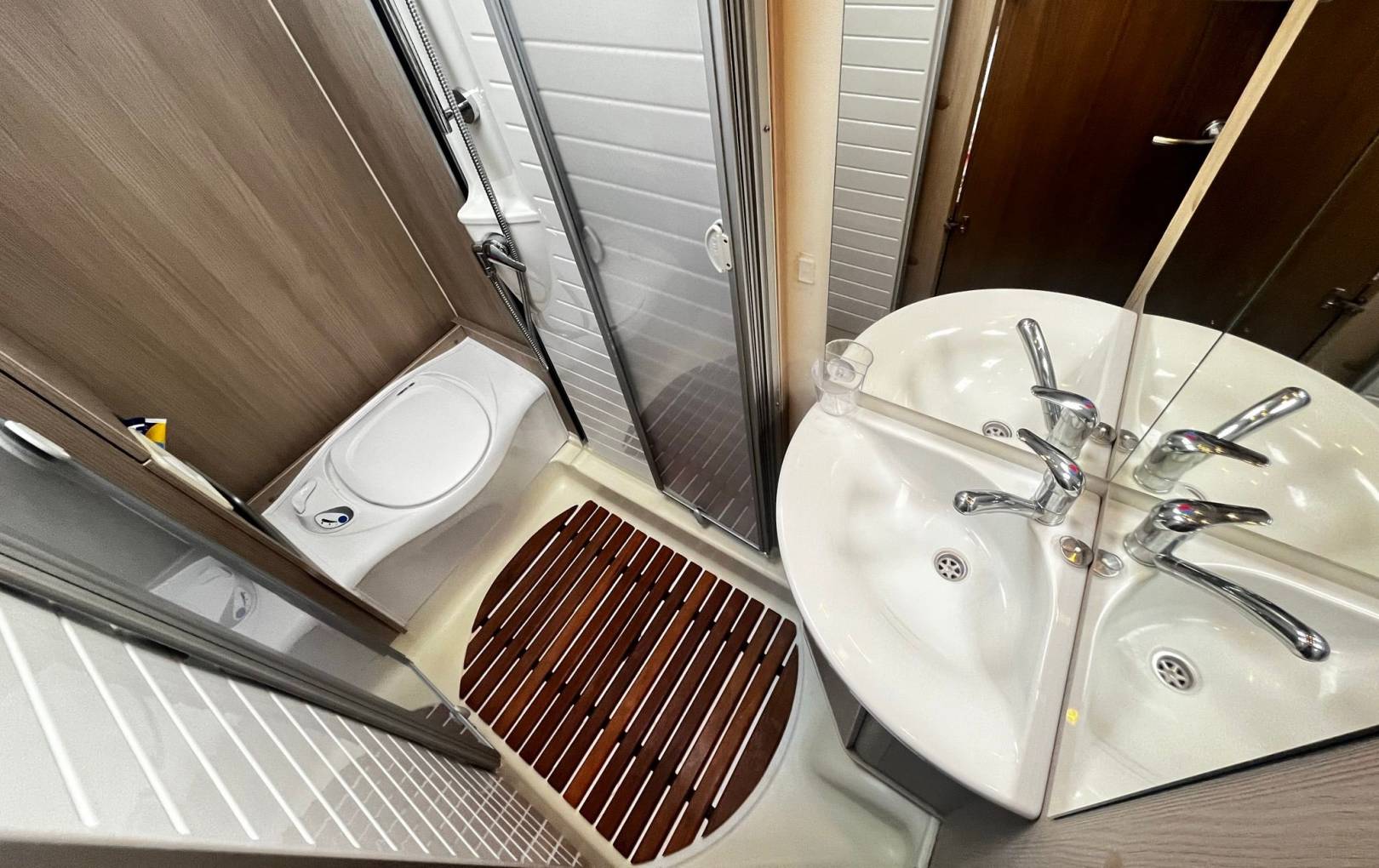 to form enclosed shower cubicle, Thetford electric flush toilet and washbasin.