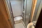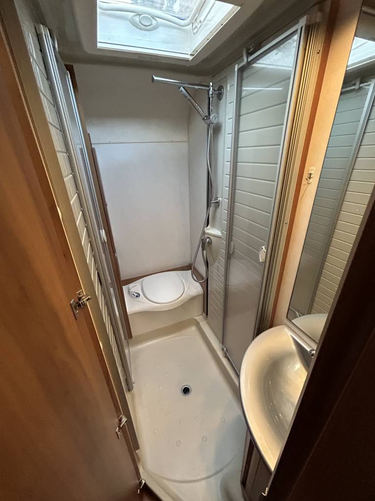 Next, we make our way to the washroom, designed with your comfort and convenience in mind. The large shower space invites you to unwind after a day of exploration. The casette toilet, sink with mixer tap, and storage cupboards complete this practical and refreshing washroom setup.