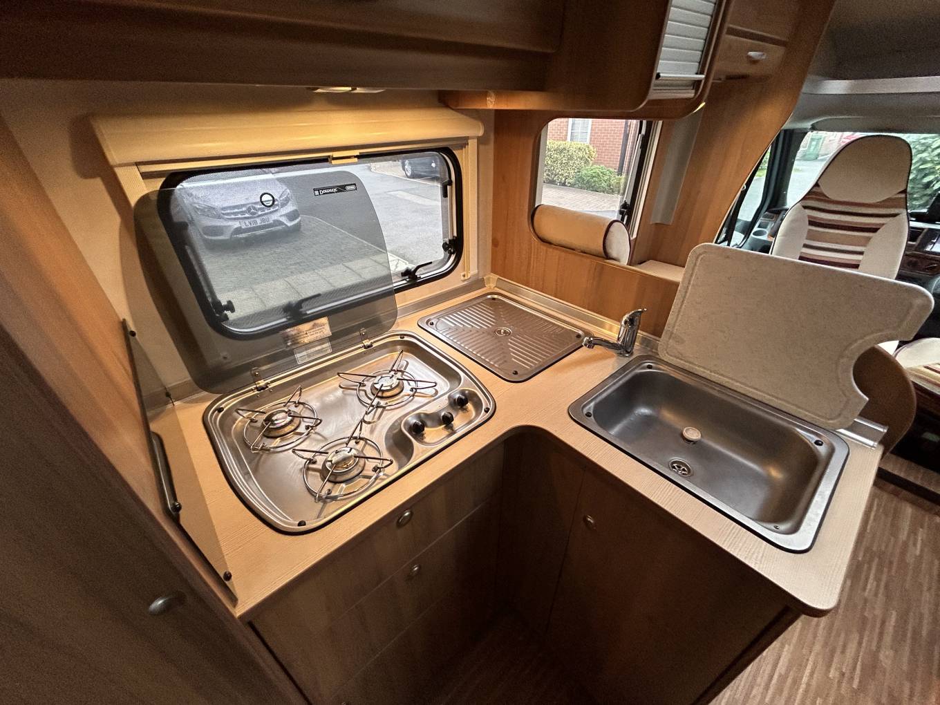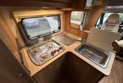 Moving towards the heart of the motorhome, we arrive at the well-equipped kitchen. On your right, you'll find a 3-ring gas burner, ideal for preparing delicious meals while you're on the move. The large sink with a mixer tap and draining board make cleaning up a breeze, and the plentiful overhead cupboard storage offers plenty of space to store all your cooking essentials.