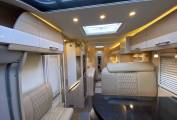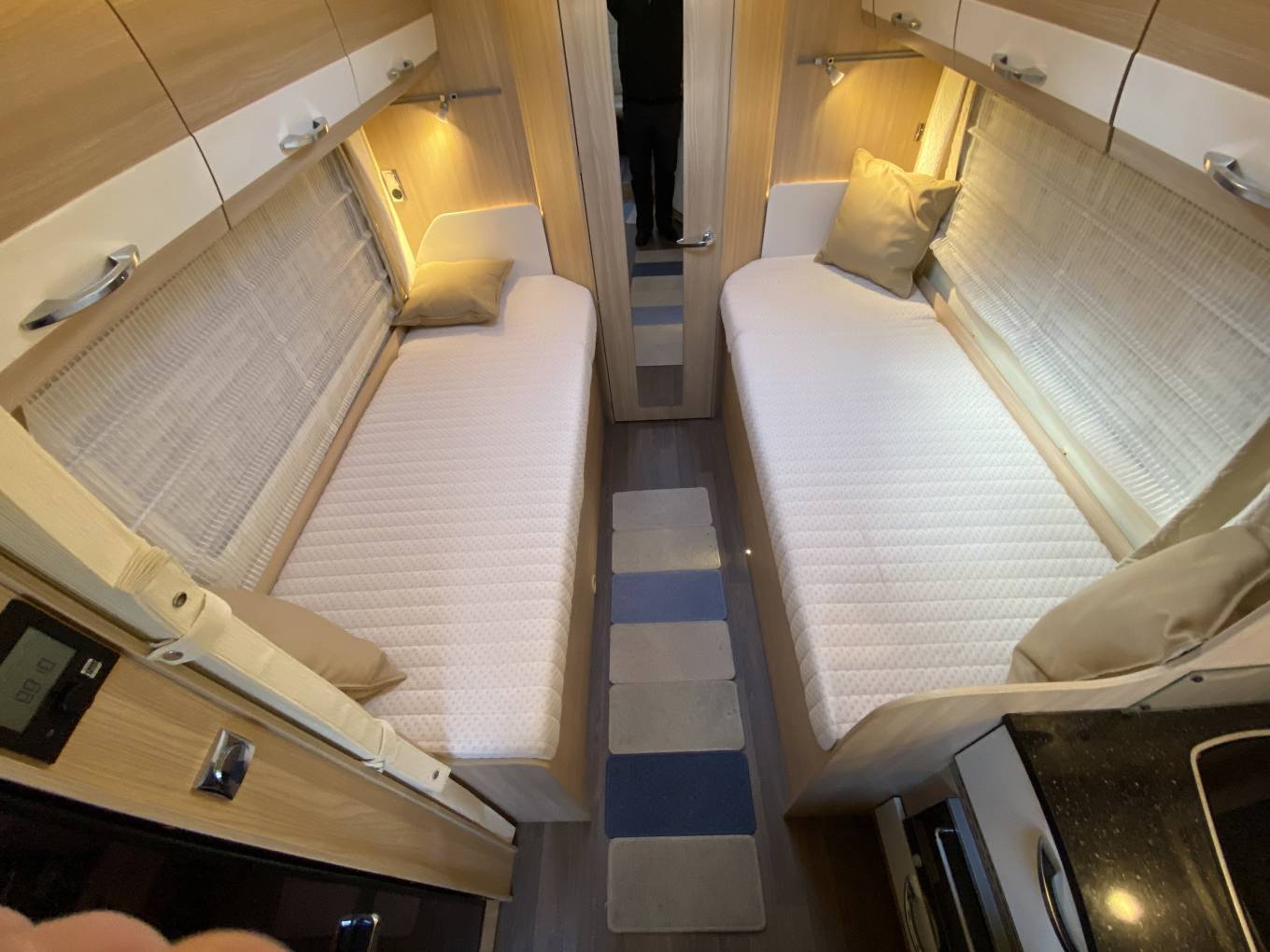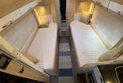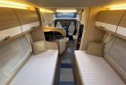 This is the Burstner Nexxo T720 special Sovereign edition with two single beds and an end bathroom. It has four seatbelts, sleeps three, is 7.4m long and has a gross weight of 3500kg.