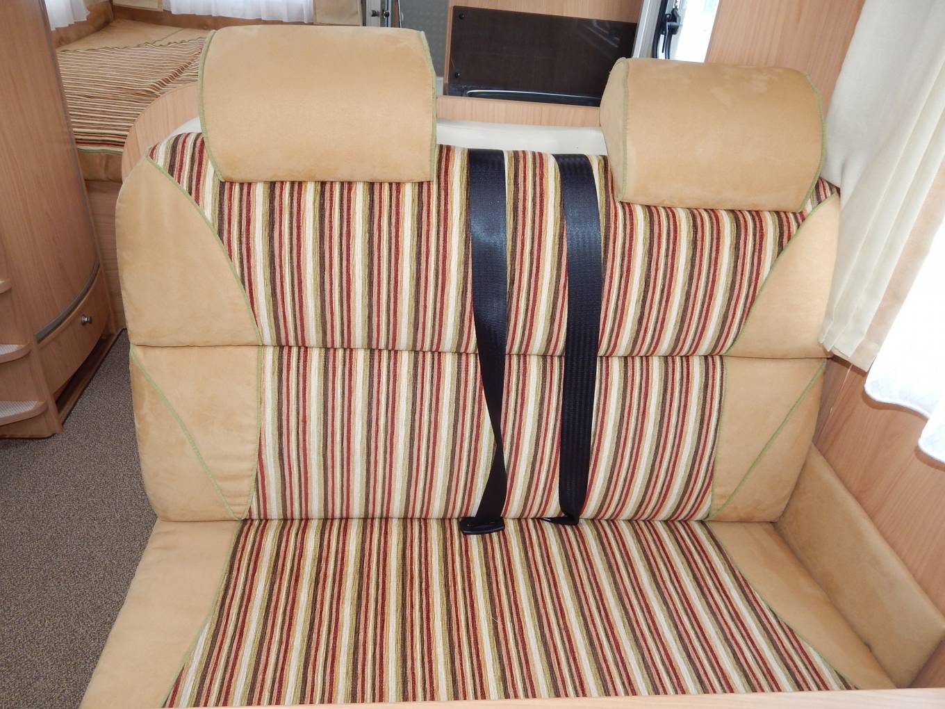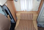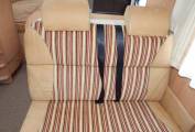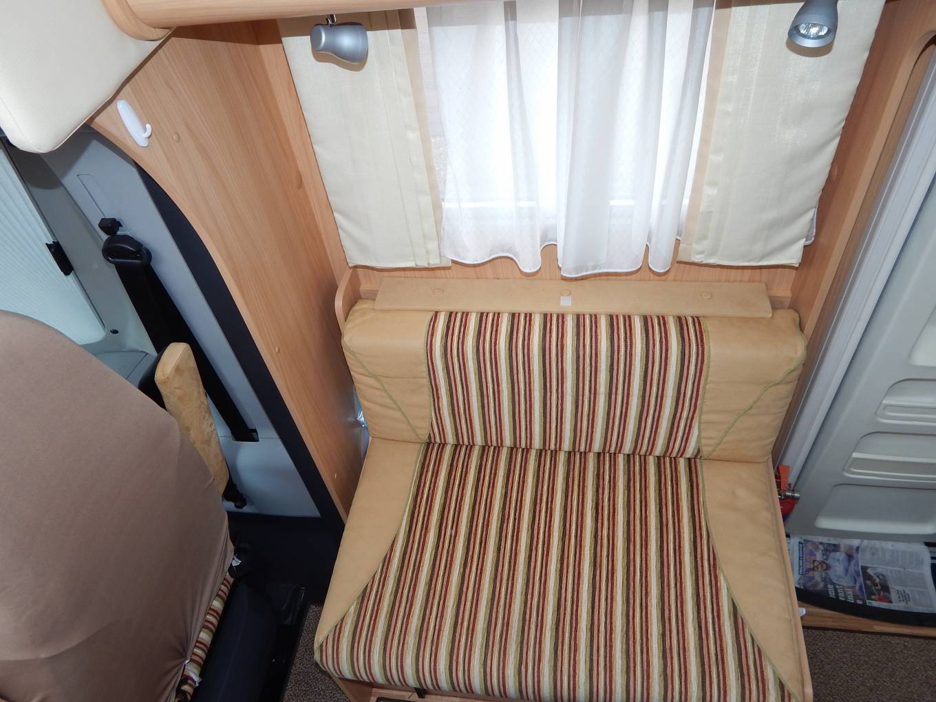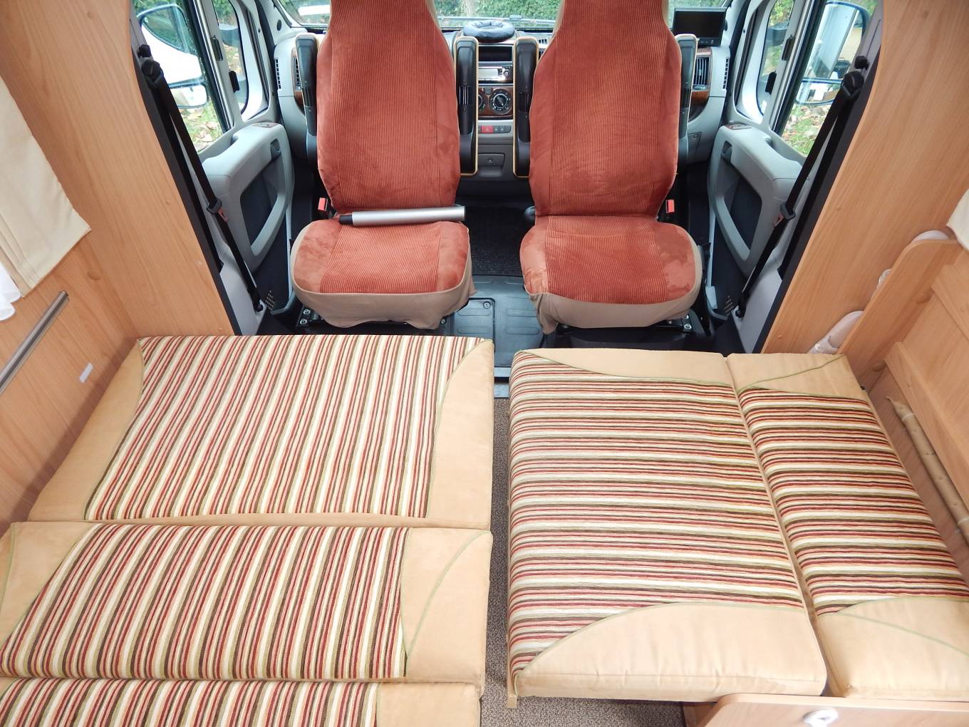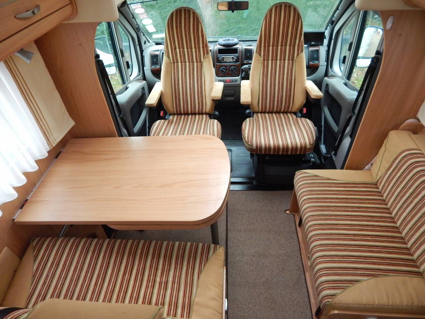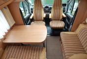 The chassis has a low step to enter but there is an additional portable step if required. The dinette is situated just to the right of the habitation door it has a fixed table with extending leaf to join a side seat. The front drivers and passengers seats also swivel round to join this area which will then comfortably seat 5. The forward facing passenger seats also have 2 x 3 point seat belts for travelling passengers. The table will also drop down to make and additional bed for 1 to 2 people.