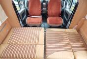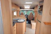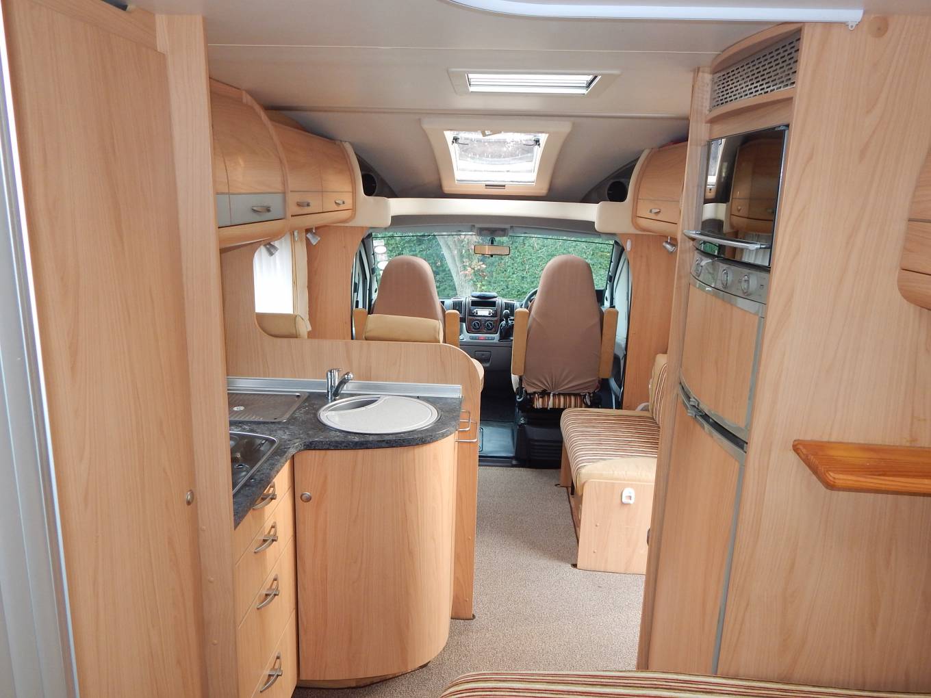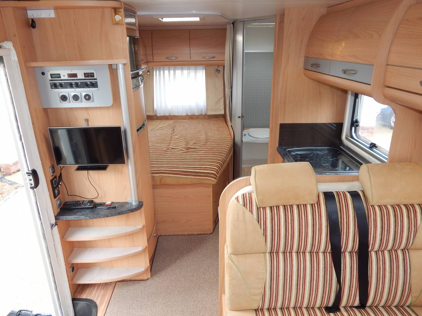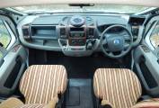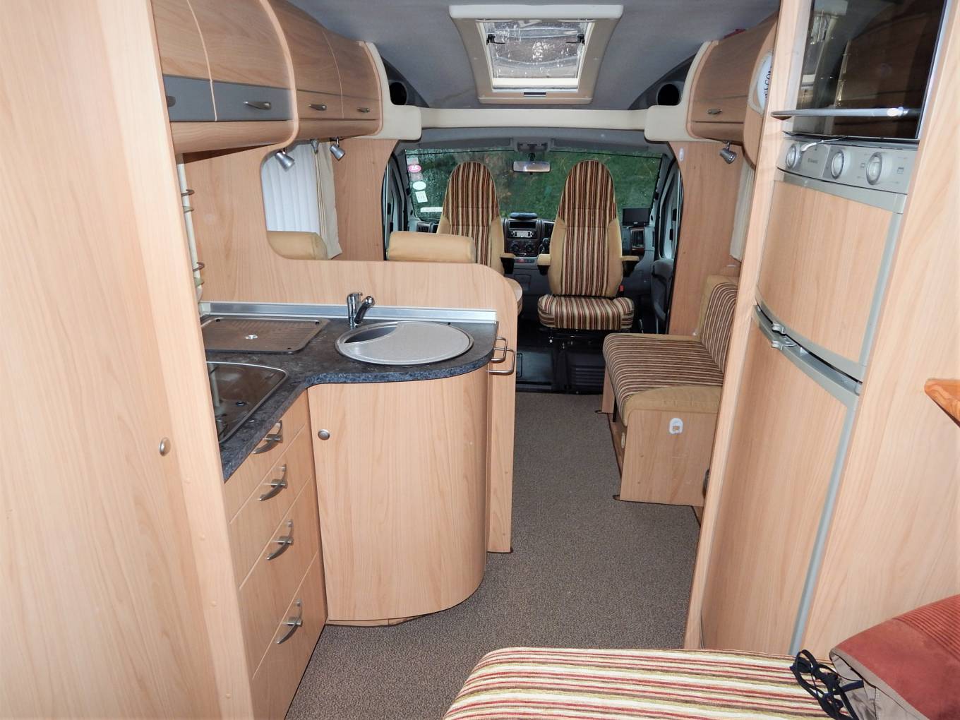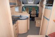 The chassis has a low step to enter but there is an additional portable step if required. The dinette is situated just to the right of the habitation door it has a fixed table with extending leaf to join a side seat. The front drivers and passengers seats also swivel round to join this area which will then comfortably seat 5. The forward facing passenger seats also have 2 x 3 point seat belts for travelling passengers. The table will also drop down to make and additional bed for 1 to 2 people.