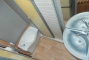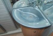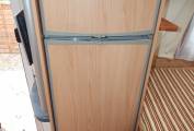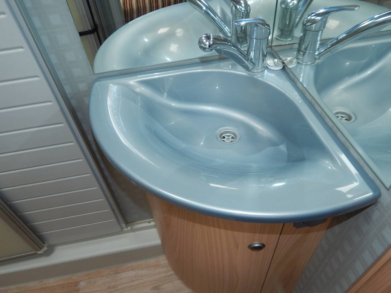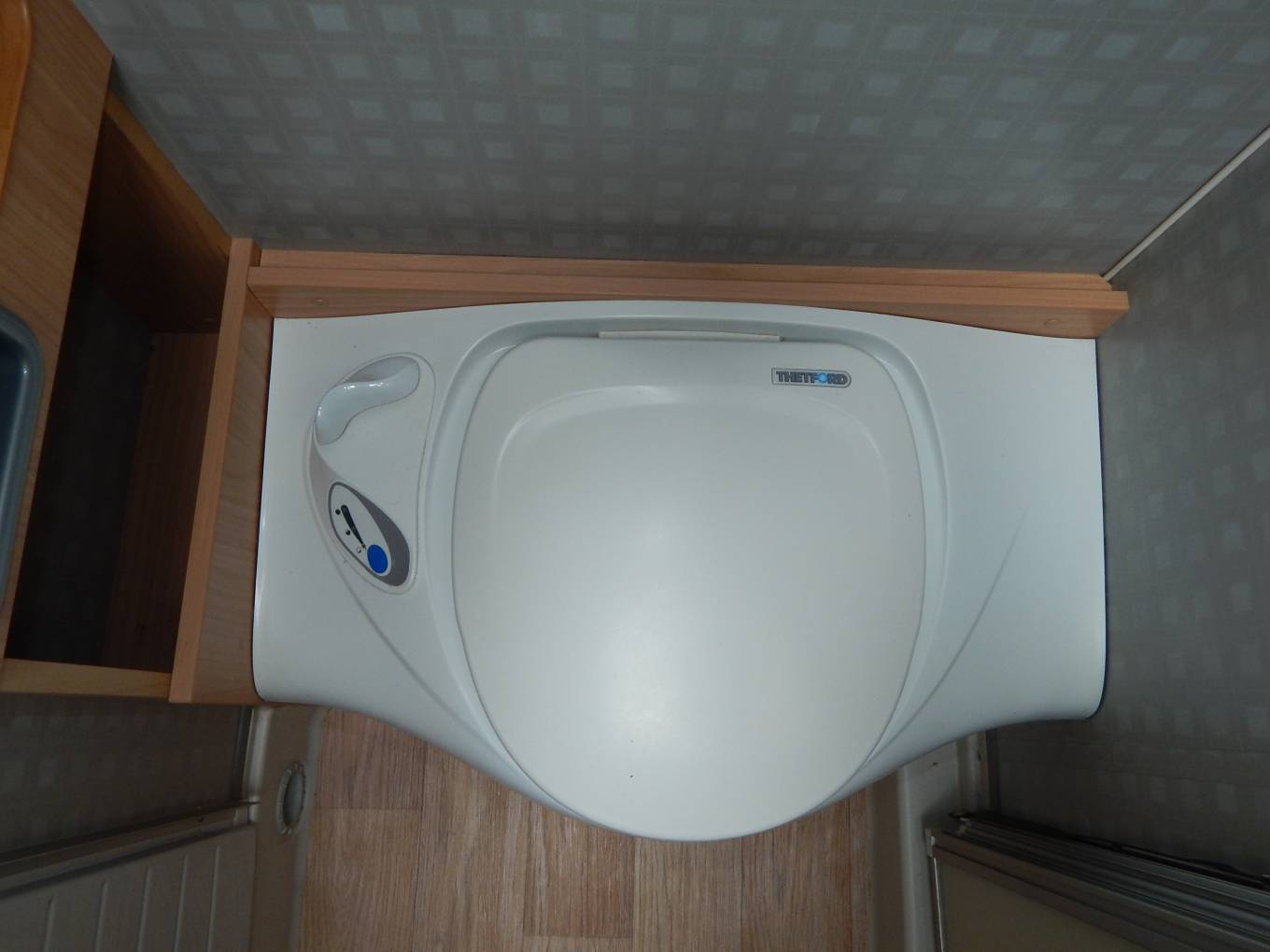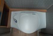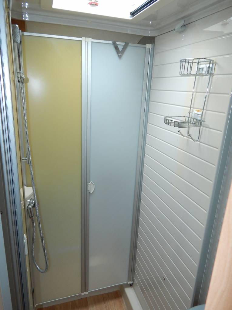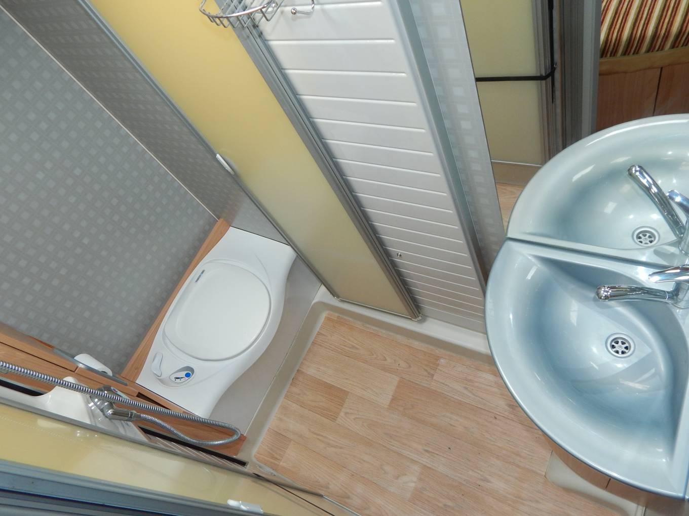 The Bathroom is light & spacious, it has a Thetford Fresh water flush cassette toilet which can be sectioned off from the shower via perspex doors front and rear. There is a built in wash hand basin with Chrome mixer tap and separate cupboard above the toilet.