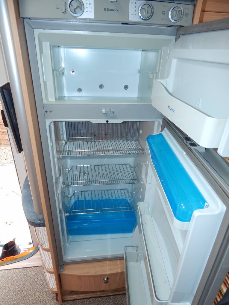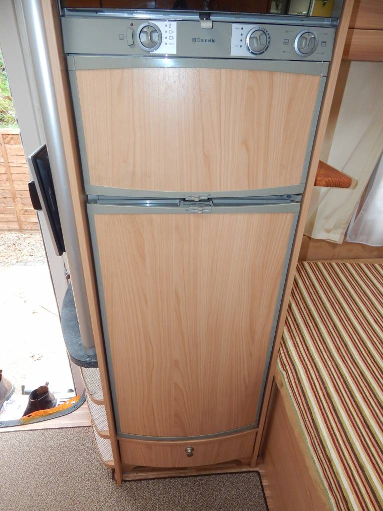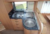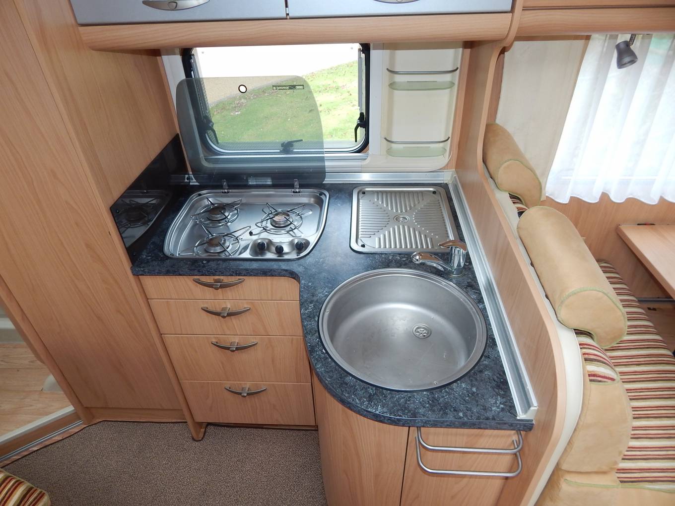 The Kitchen area is just behind and consists if an L shaped worktop incorporating a round brushed metal finish sink & seperate drainer with chrome mixer tap. A 3 Gas Burner Hob with ample drawer & cupboard space above and below. Opposite there is Dometic Tec Tower with an Oven & grill over a large fridge with separate freezer compartment, this is an absorber type and can be powered by 240v, 12v or gas depending whether your are plugged in on site or wild camping.