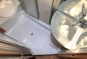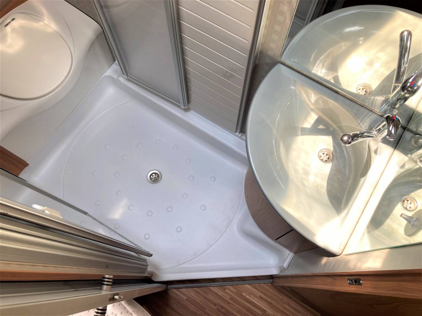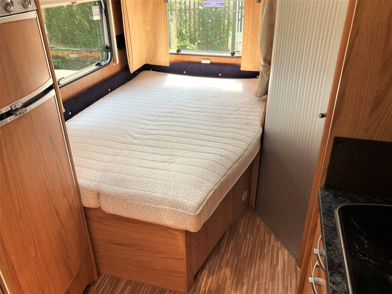 The rear large fixed bed has a mass of storage underneath and in the corner is a very large bathroom with separate shower.