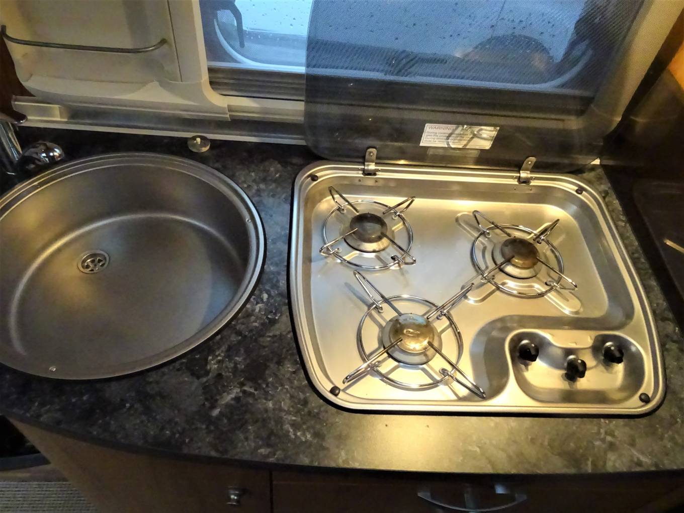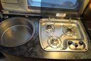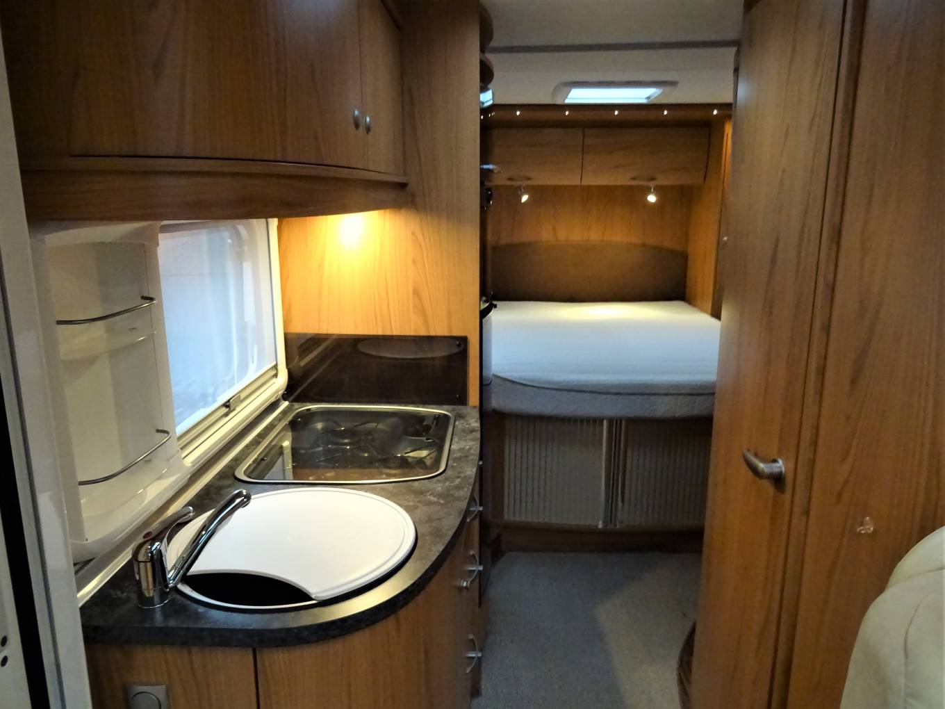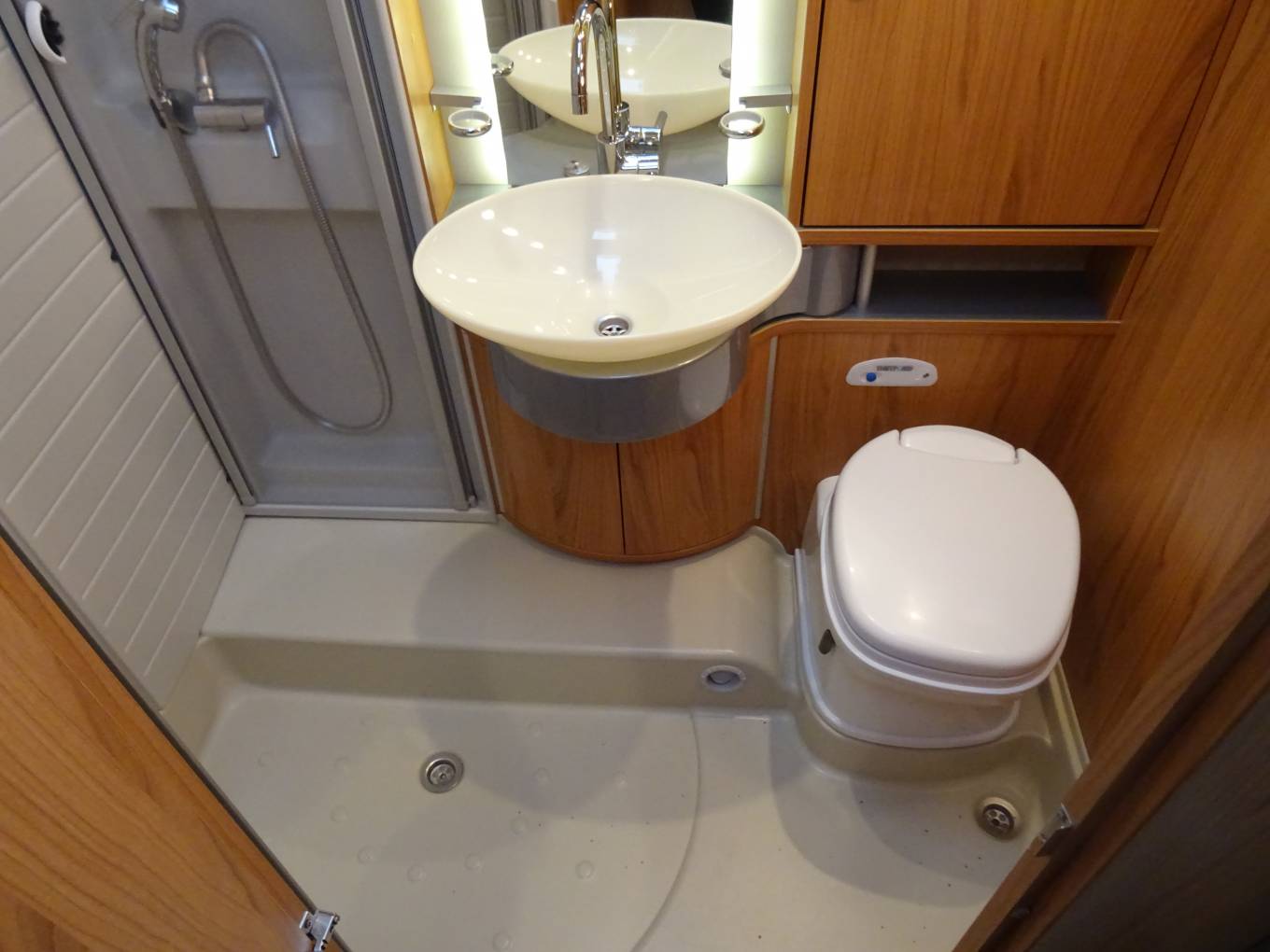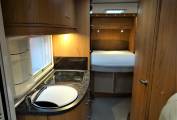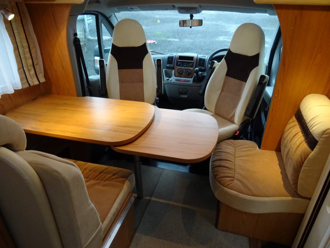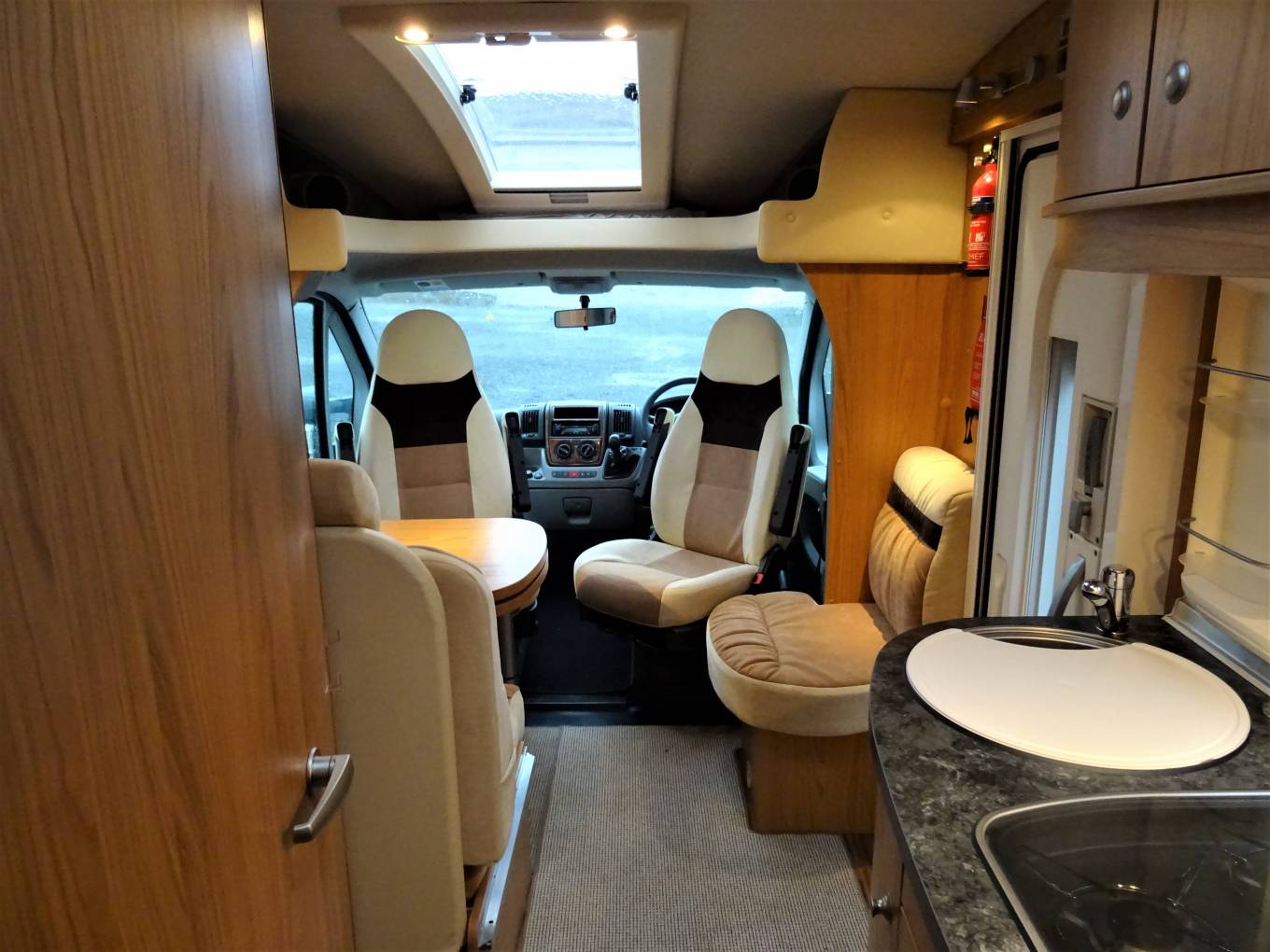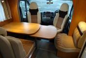 The Motorhome has a spacious rear island bedroom area with plenty of storage. In the bedroom area and also outside in the large garage area. Powered by a 3 litre Fiat engine with all the in-cab enhancements such as electric windows, electric mirrors, and a Blaupunkt entertainment system. The interior has a light and airy feel, aided by the large skylight over the cab and further skylights in the habitation. All windows and skylights have fly screen and blackout screens creating a safe and cosy atmosphere. The front "Captain" style seats both swivel and with the table extension this creates an intimate dining area for up to 5 people in comfort. The kitchen is fully equipped with lots of storage space, 3 ring gas hob, sink, combined oven and grill, a large fridge and separate freezer. The washroom is immaculate and comes with washbasin, cassette toilet and a full height shower in it's own area with screen.
