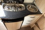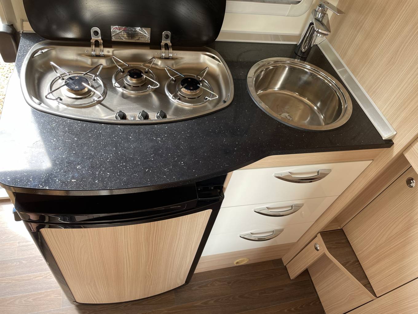 is a 3-ring gas hob, a microwave, a sink with mixer tap and Dometic 3 way