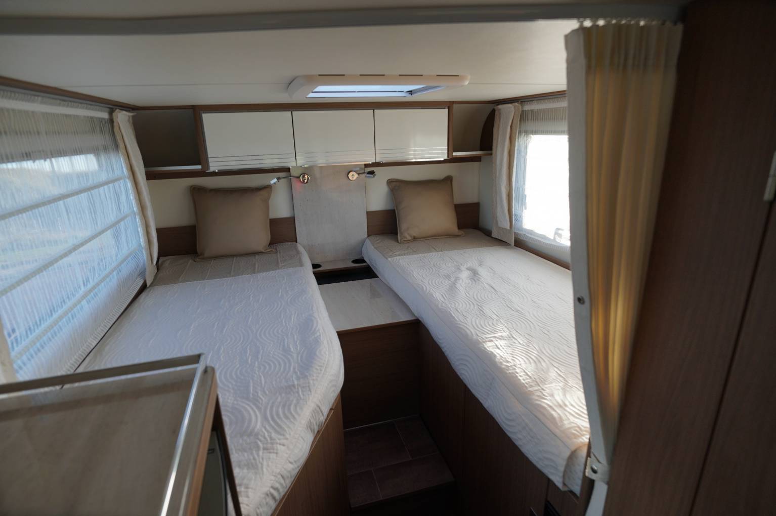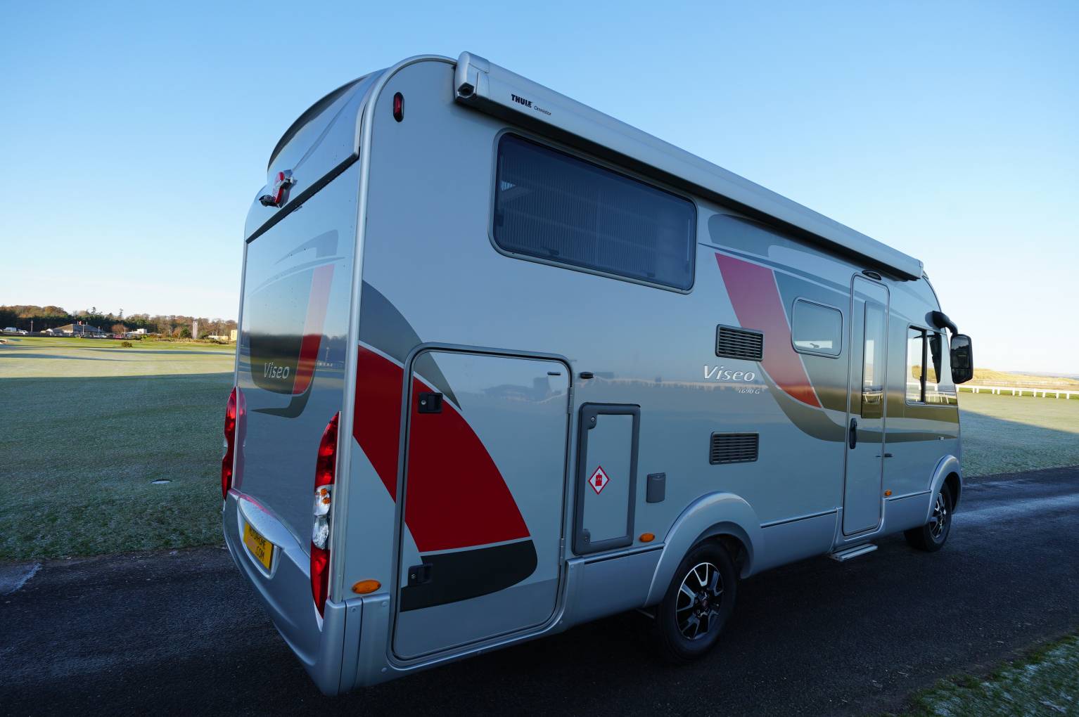 This 2017 A-Class, Bürstner Viseo i690G finished in metallic silver is in superb condition throughout. Based on the Fiat 2.3 litre, 150HP engine with comfort-matic automatic gearbox and cruise control. The cab has Remis insulating blinds, climate-controlled air conditioning, heated seats, electric mirrors and Pioneer multi-media system incorporating a colour reversing camera. In the rear you will find twin Rear Beds, and a pull-down double bed above the cab. The lounge / dining area comprises of a forward-facing settee with two travelling seatbelts and the two swivelling Captain’s seats all finished in attractive biscuit coloured leather with dining table with swivel extension. There is also a wall mounted TV / DVD installed in this area. The practical kitchen consists of a 3-burner gas hob, sink with mixer tap, extractor fan, oven with grill and 3-way fridge/freezer. The washroom consists of a Thetford cassette toilet, basin with mixer tap, mirror, storage cupboard and unique folding wall that creates a shower area. The central heating and hot water system is supplied by a Truma combi heater. There is also underfloor heating, removable carpets and double glazing throughout. It has a large 100 litre fresh water tank and a heated 100 litre waste water tank, perfect for winter motorhoming. It also has a very large payload.