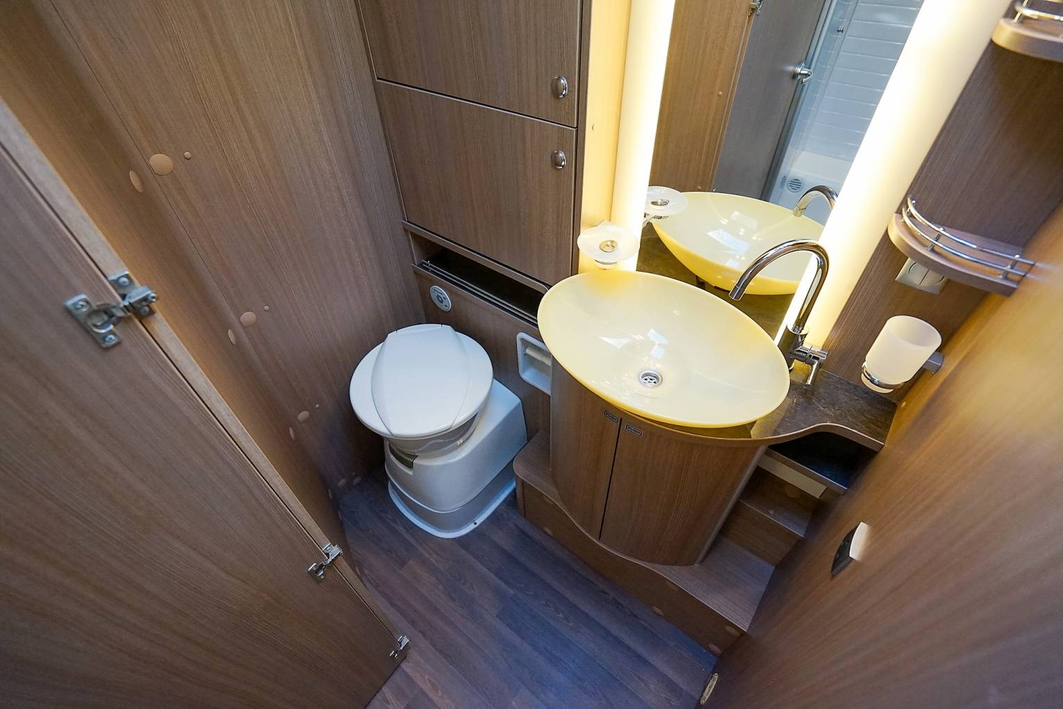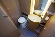 and washroom with designer washbasin, cassette toilet and vanity unit on the