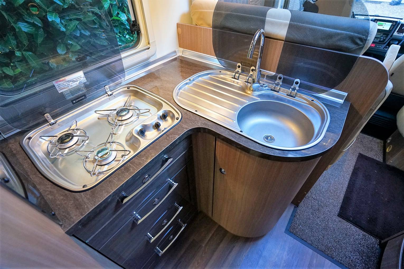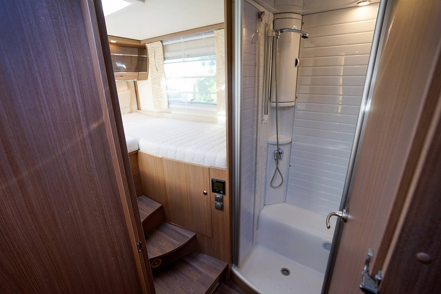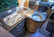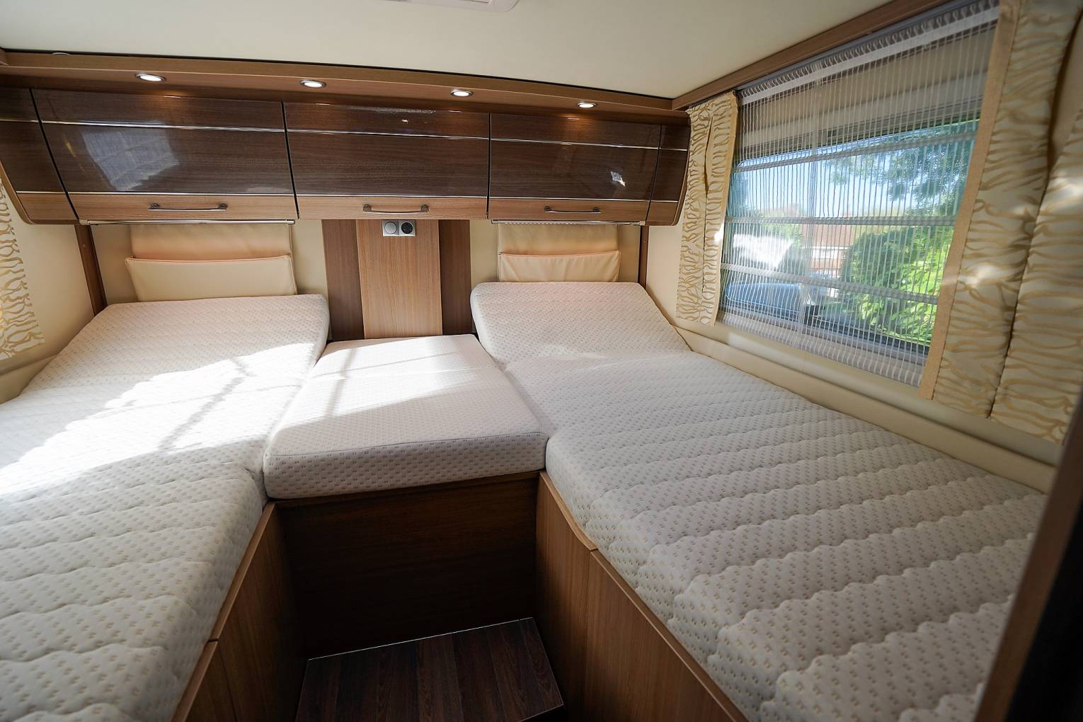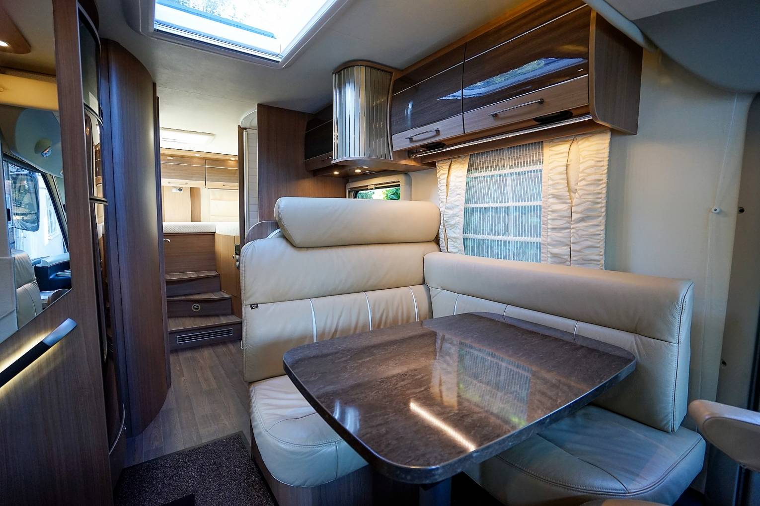 seats. Above is the neatly concealed drop-down double bed. Central luxuriously