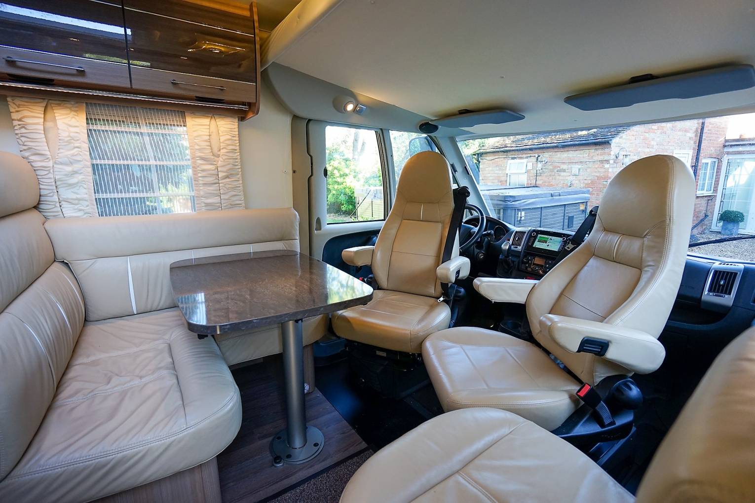 TV in bespoke cabinet, pleated cab blinds, combined Sat Nav/Reverse Camera,