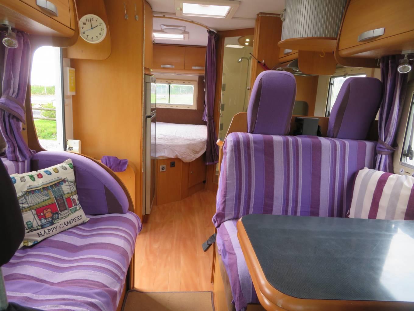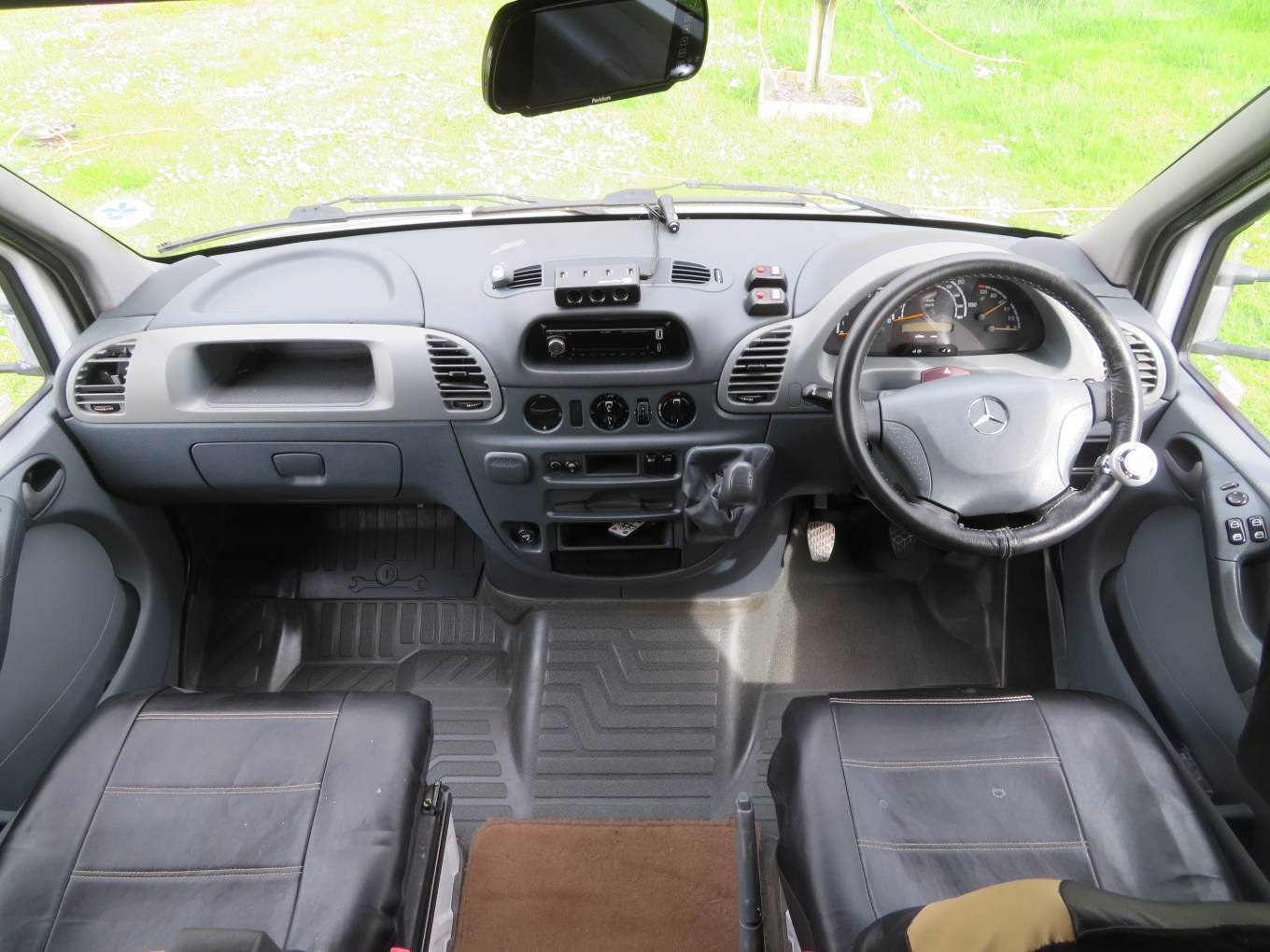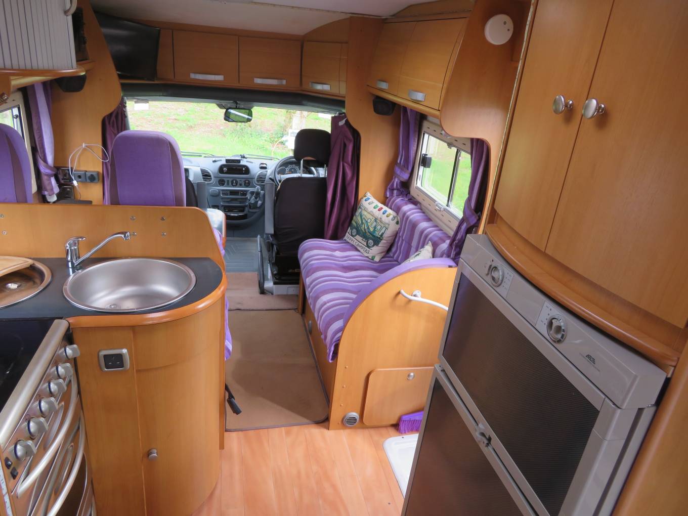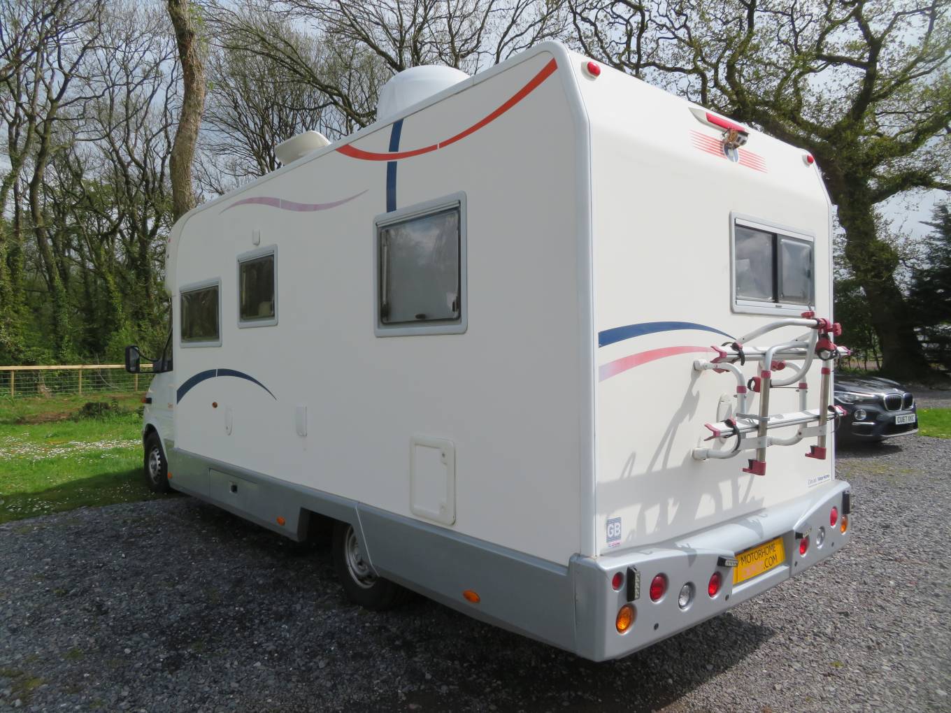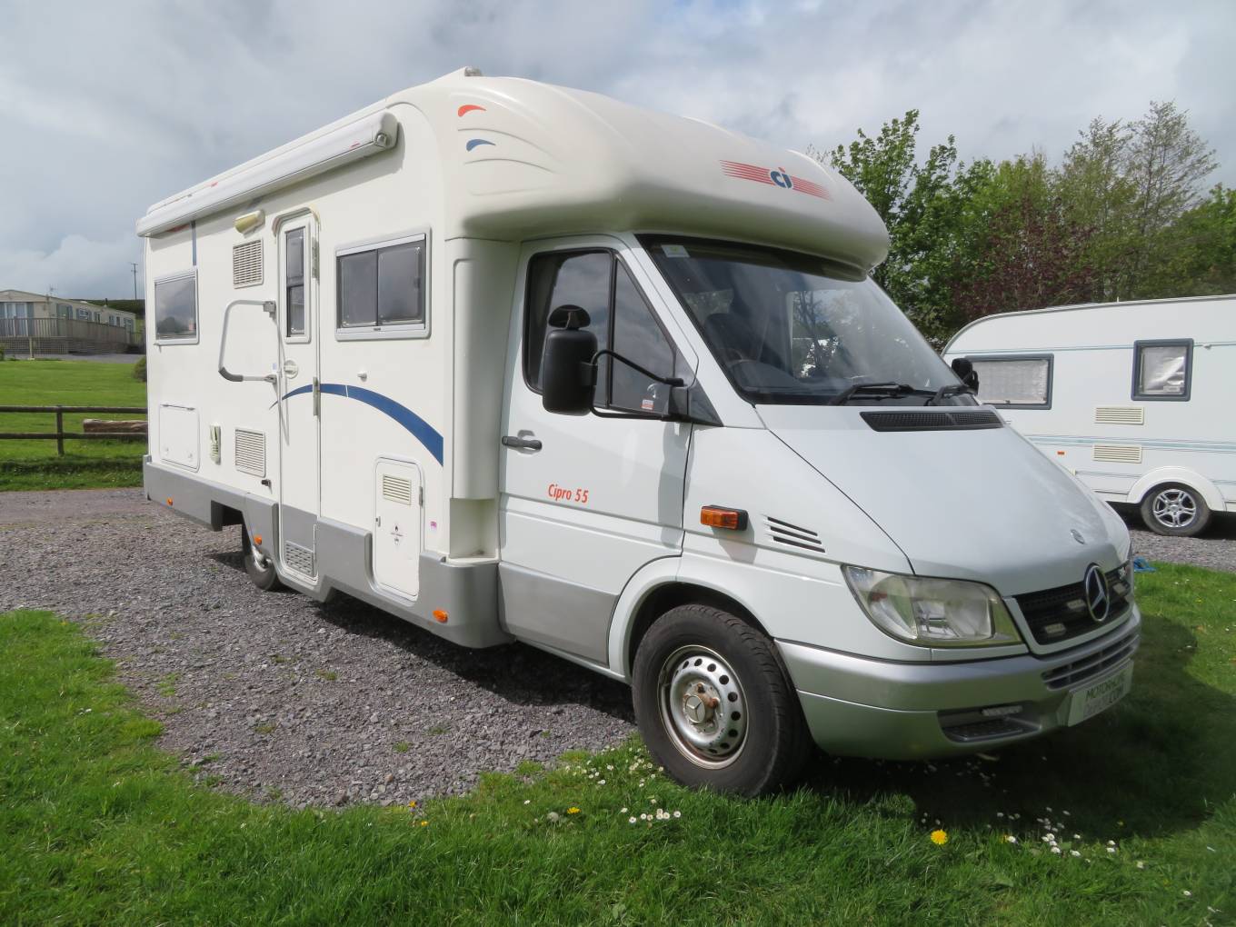 2005 MODEL CARAVAN INTERNATIONAL CIPRO 55, 4 BERTH MOTORHOME BUILT ON THE MERCEDES SPRINTER CHASSIS AND POWERED BY THE 2.7 TURBO DIESEL ENGINE. FULLY DOCUMENTED SERVICE HISTORY UP TO 2019 AND ONLY 54'000 MILES. WHAT A LOT OF MOTORHOME. Central dinette seating area which has been protected with covers, fitted with 2 rear seat belts, 2 rotating captain seats, Radio, Reversing camera, Max-view roof mounted Satellite system, Central galley kitchen with 4 burner hob, oven , grill, hob extractor fan, Large 3 way fridge with separate freezer, lots of work top space for preparing your favourite dishes. Fixed French bed, large washroom with cassette toilet, Shower, hand basin and vanity storage unit. On board two fresh and one waste water tank, Wabasto blown air heating system, Out side features include full sized canopy awning, external lockers, two solar panels, bike rack, rear parking sensors and dual reversing camera.
