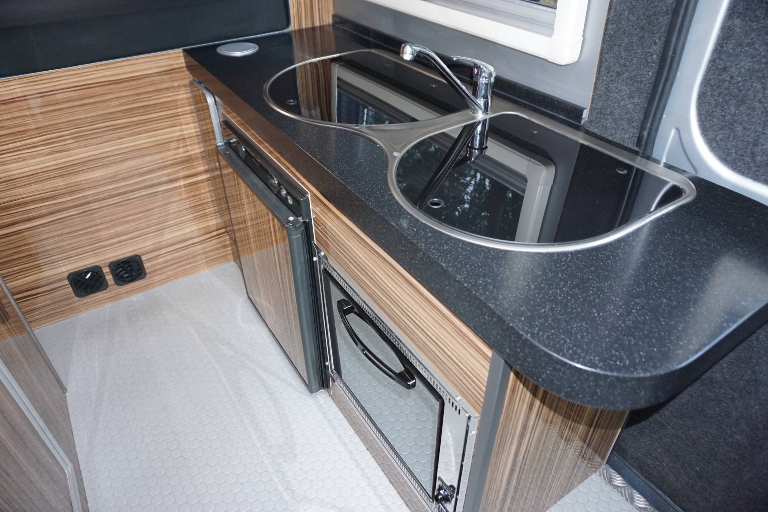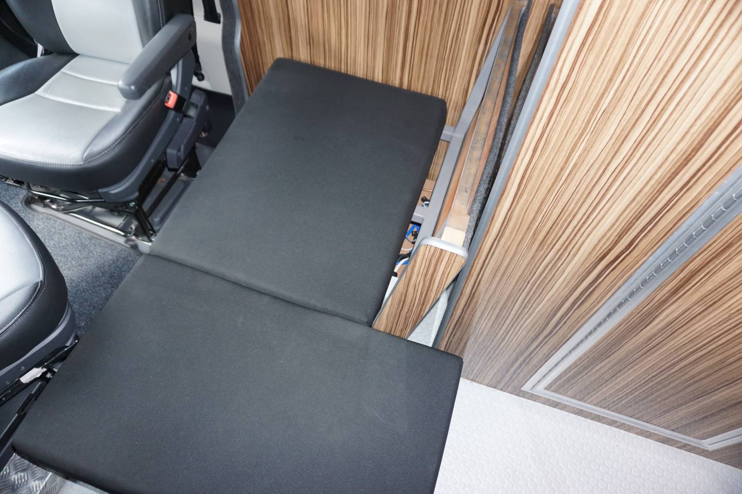 I present to you this very stylish and professionally converted Fiat Ducato Camper van. To the front of the van entering from the side door there are two swivel seats and one forward facing seat that make the social seating area. This can be converted into a single bed for the extra quest.