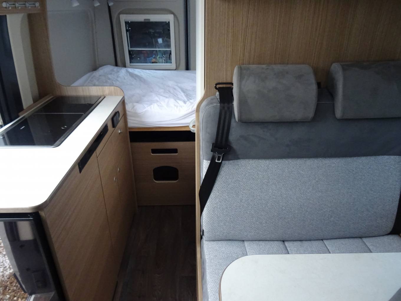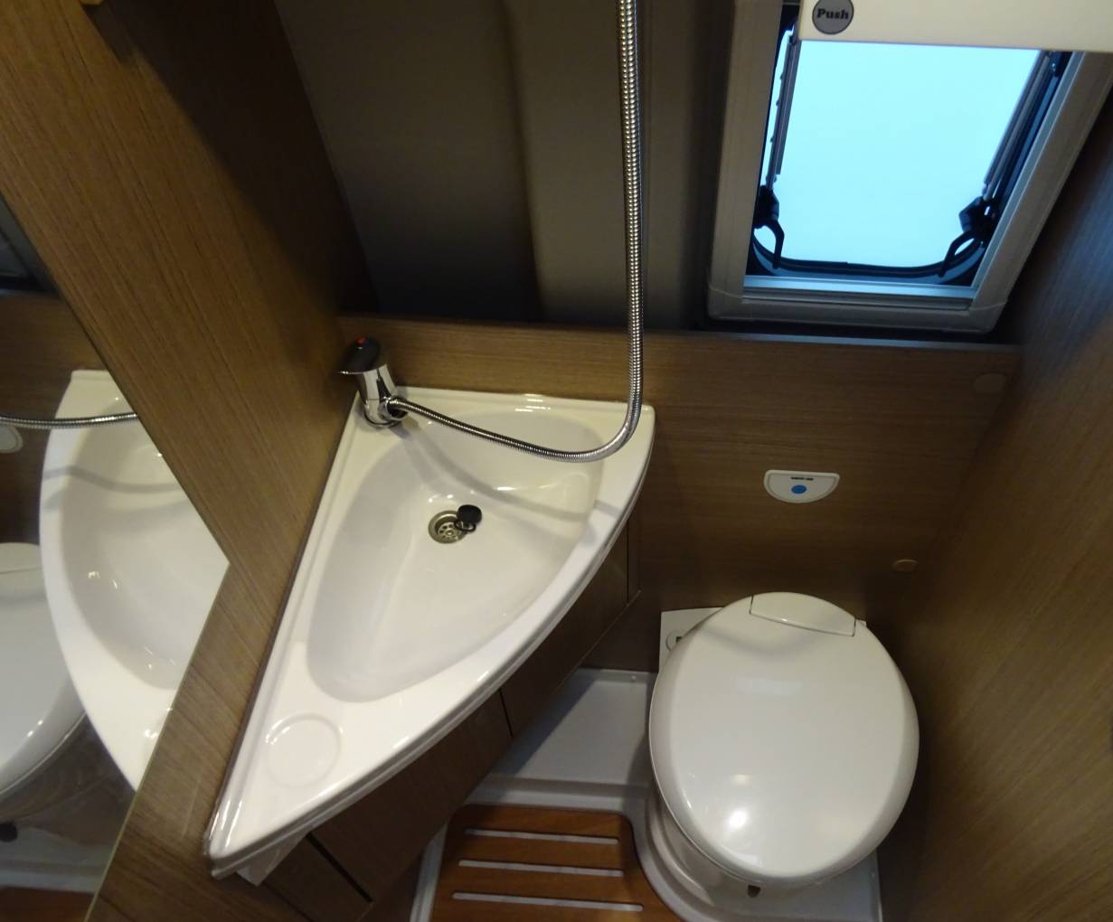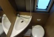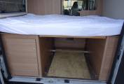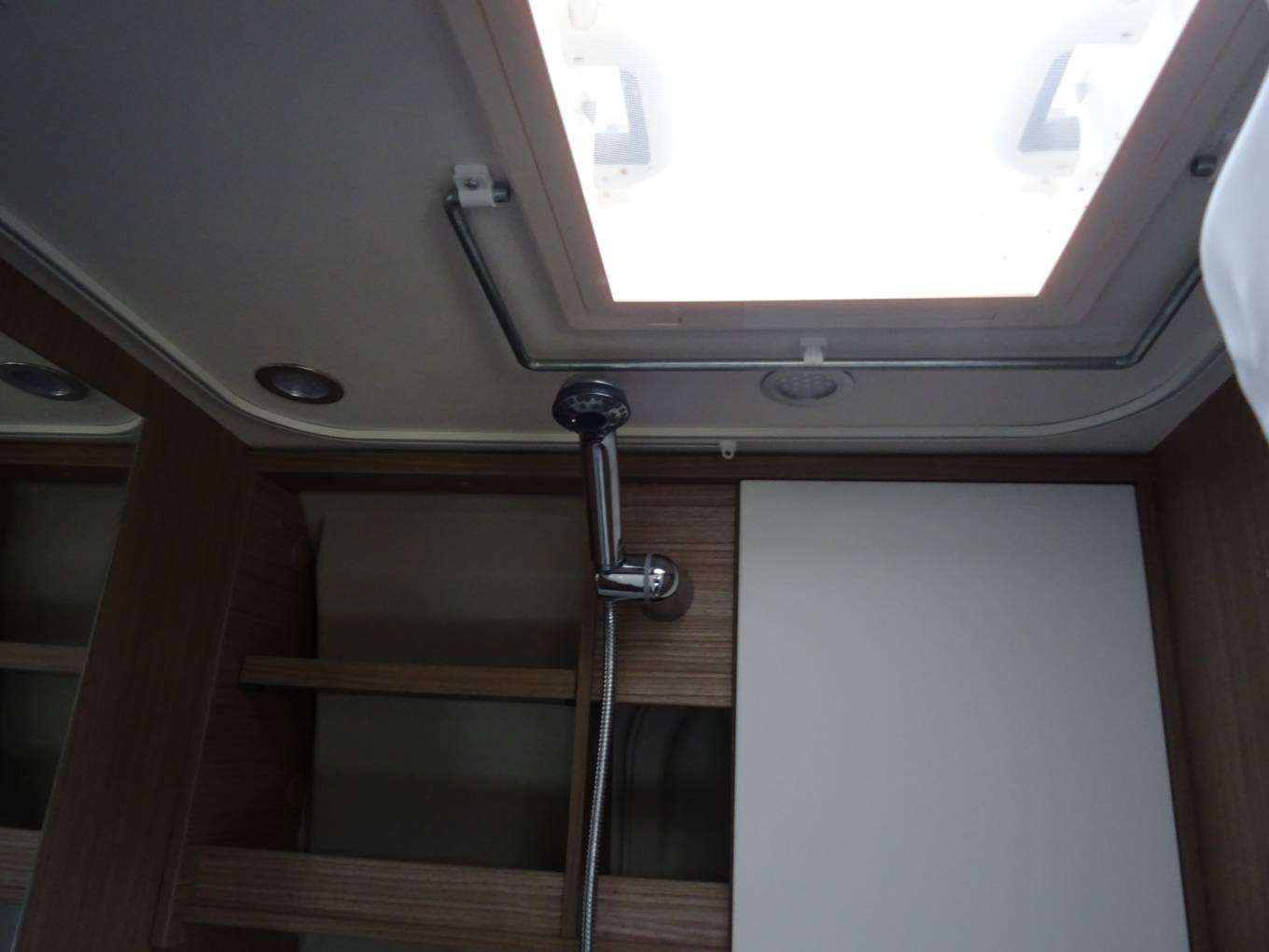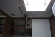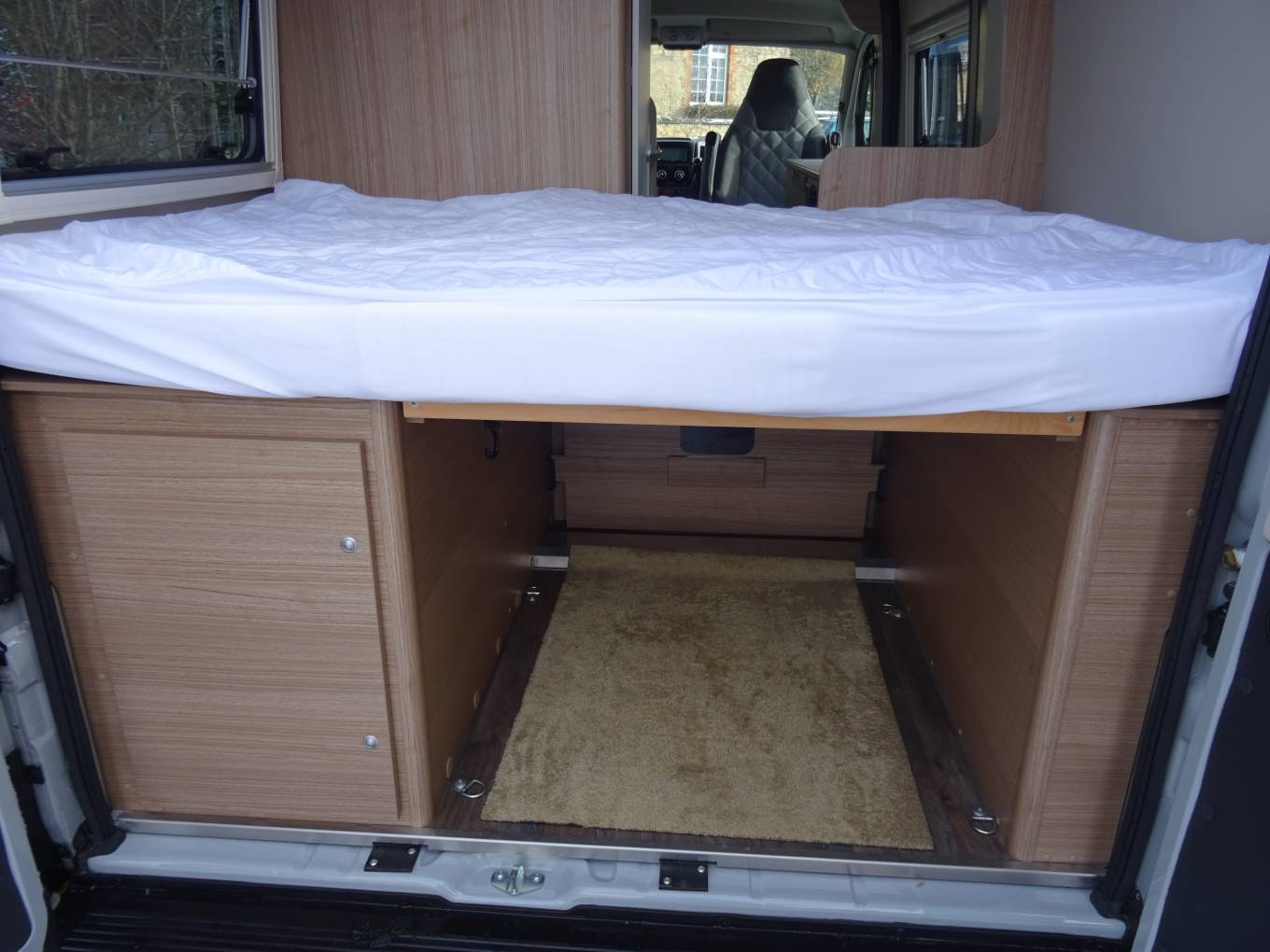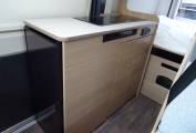 At the rear, is a fixed transverse double bed with good central storage underneath and side cupboard for 2 gas bottles. The bedroom has windows to side and rear with a skylight above, all with blinds and fly screens. We have stylish storage cupboards, excellent lighting and a usb point.