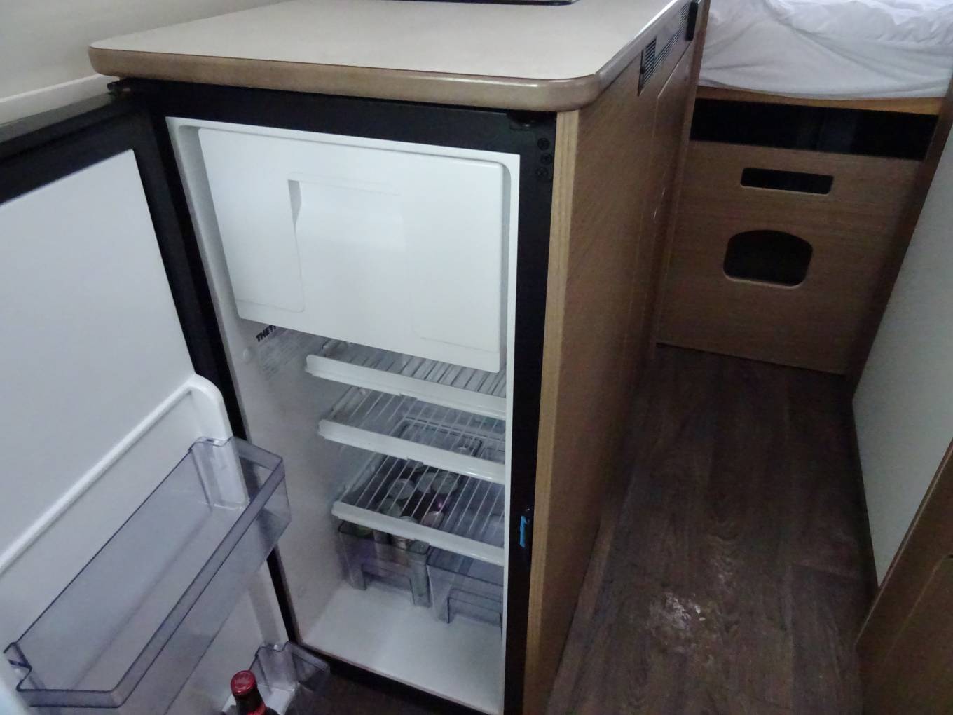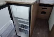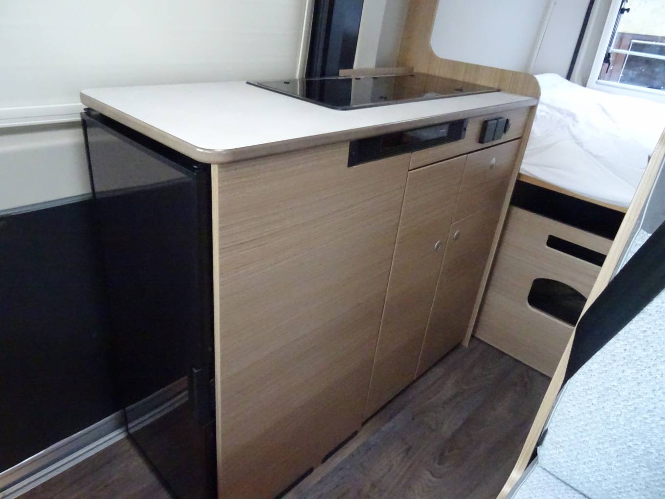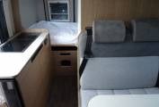 Moving up on the drivers side we have the kitchen area, with 2 gas hob burner, sink with hot & cold mixer tap, all in stainless. With the cover down we have a good prep area. There are storage cupboards below, a cutlery drawer, 2 240 v sockets and a usb point. The 12v Thetford fridge is cleverly arranged on the end and has a 54 litre capacity.