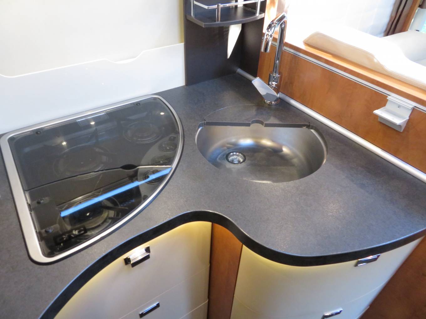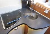 This motorhome has a well equipped kitchen which has everything you would need to prepare a light snack or meal. There is a hob with 3 gas burners, oven, grill and sink with mixer tap. There is also a large fridge with separate freezer as well as plenty of draws and cupboard space for all your cooking utensils and ingredients.
