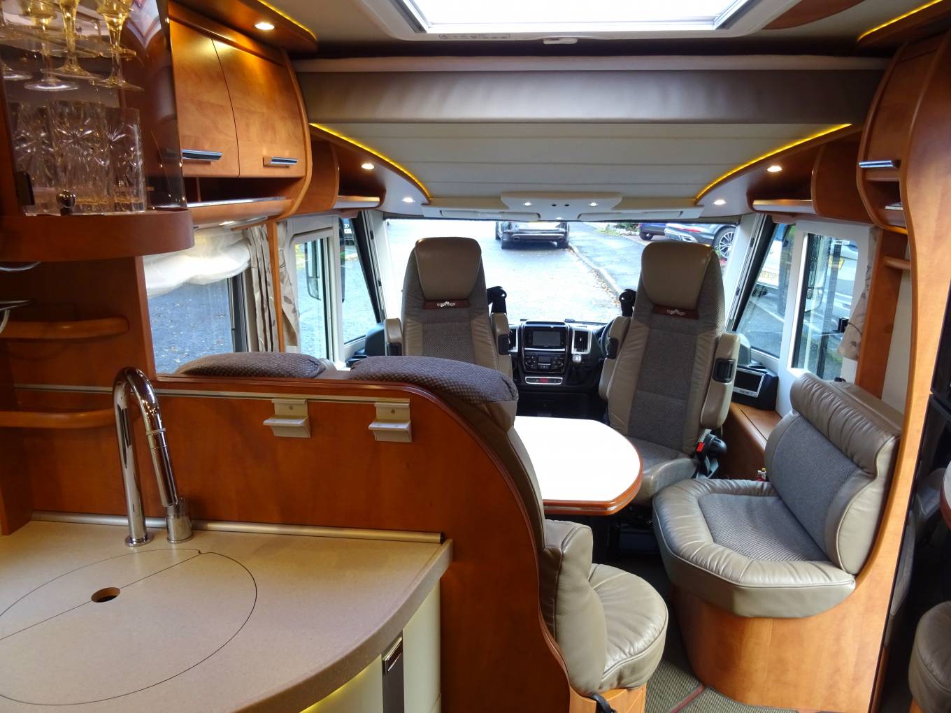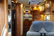 Essentially the layout is comprised of a Super King sized rear fixed bed over a large garage (The bed can be 2 singles if needed), en suite washroom , centre kitchen, forward dinette and swivel cab seats. With the cab seats swivelled, there is ample room for relaxation, dining or entertaining with a large drop down bed over the cab area if needed.