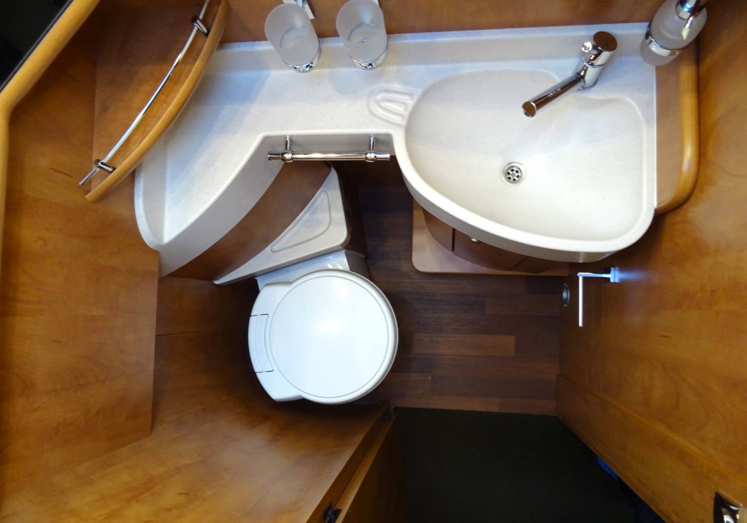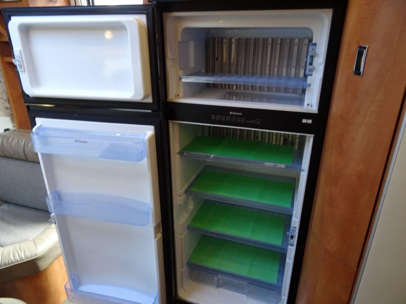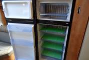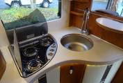 The mid-home compact kitchen area has a three-burner hob and a stainless-steel sink, with lids for both providing a continuous work surface. There is a tower fridge with a separate freezer unit and gas oven above. The kitchen has a hidden drop down storage shelf for a coffer machine or kettle. Plenty of storage in overhead cupboards, shelves, and drawer units beneath the counter top. Just rear of this is the stylish, bright washroom with lavatory, washbasin and a separate shower opposite. When open, the door to the washroom provides a privacy divider between the front and rear of the home.