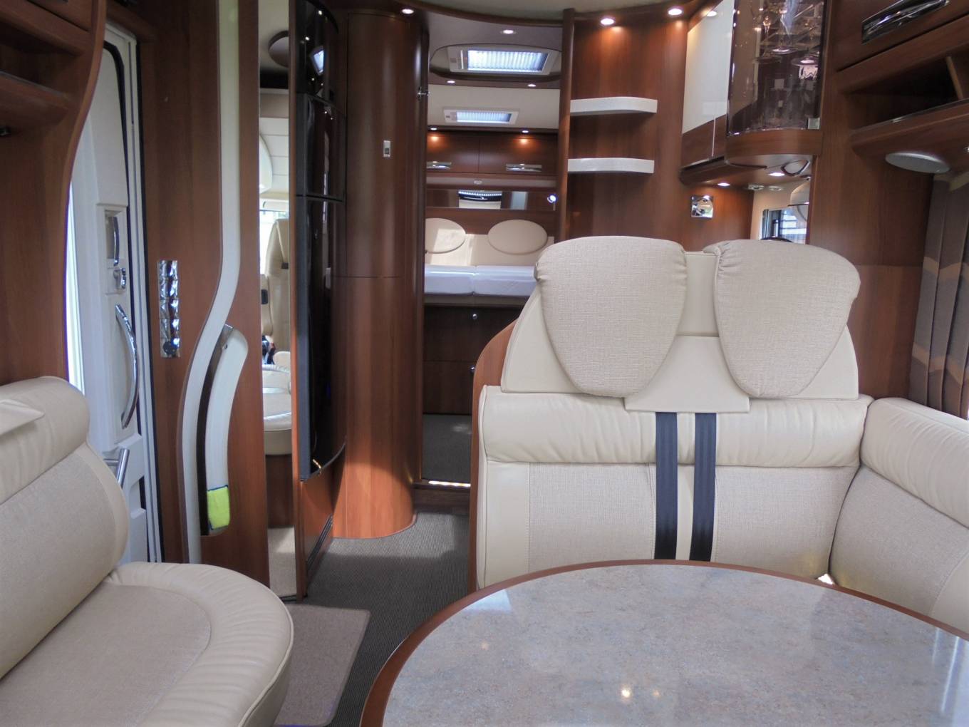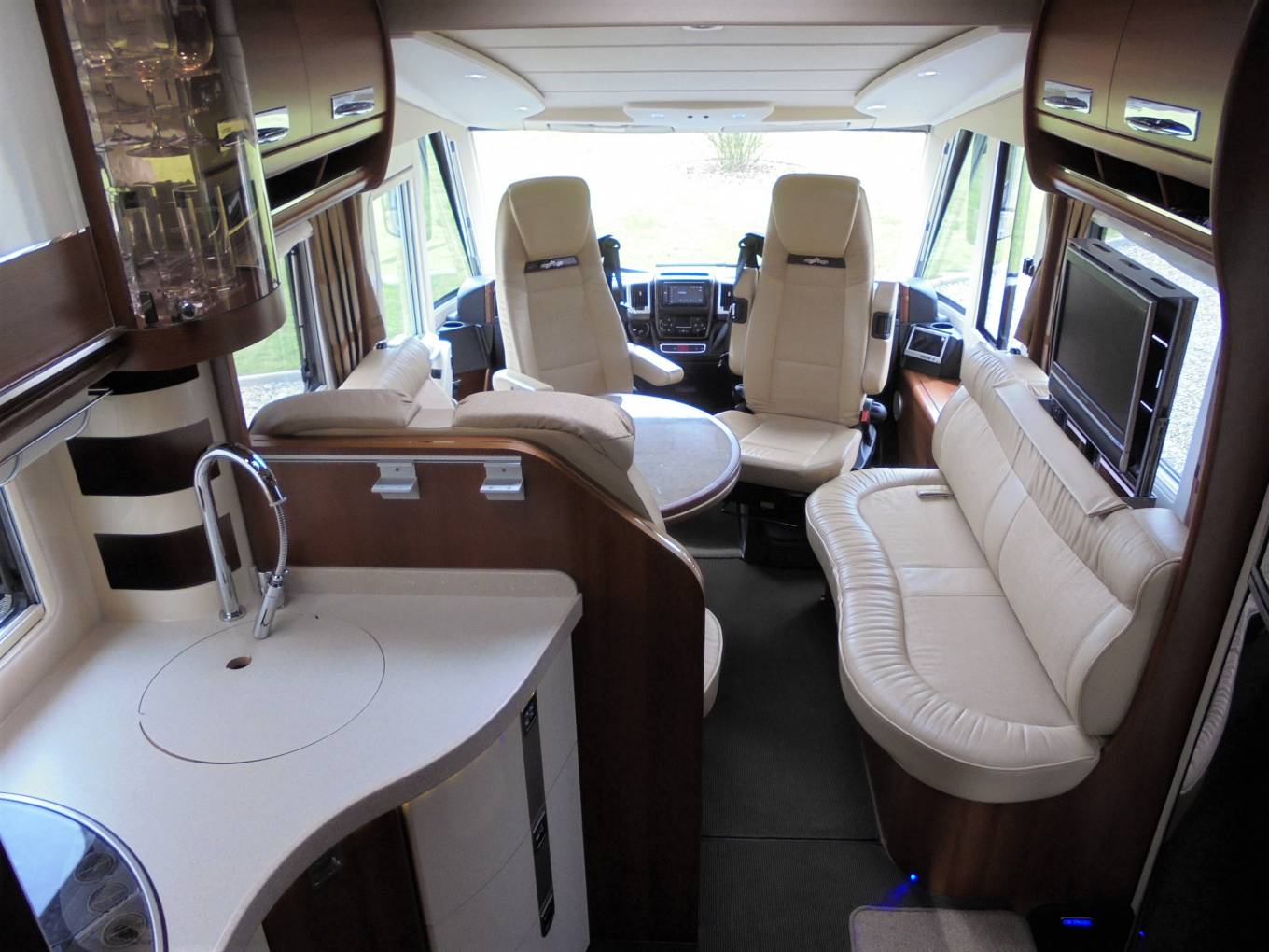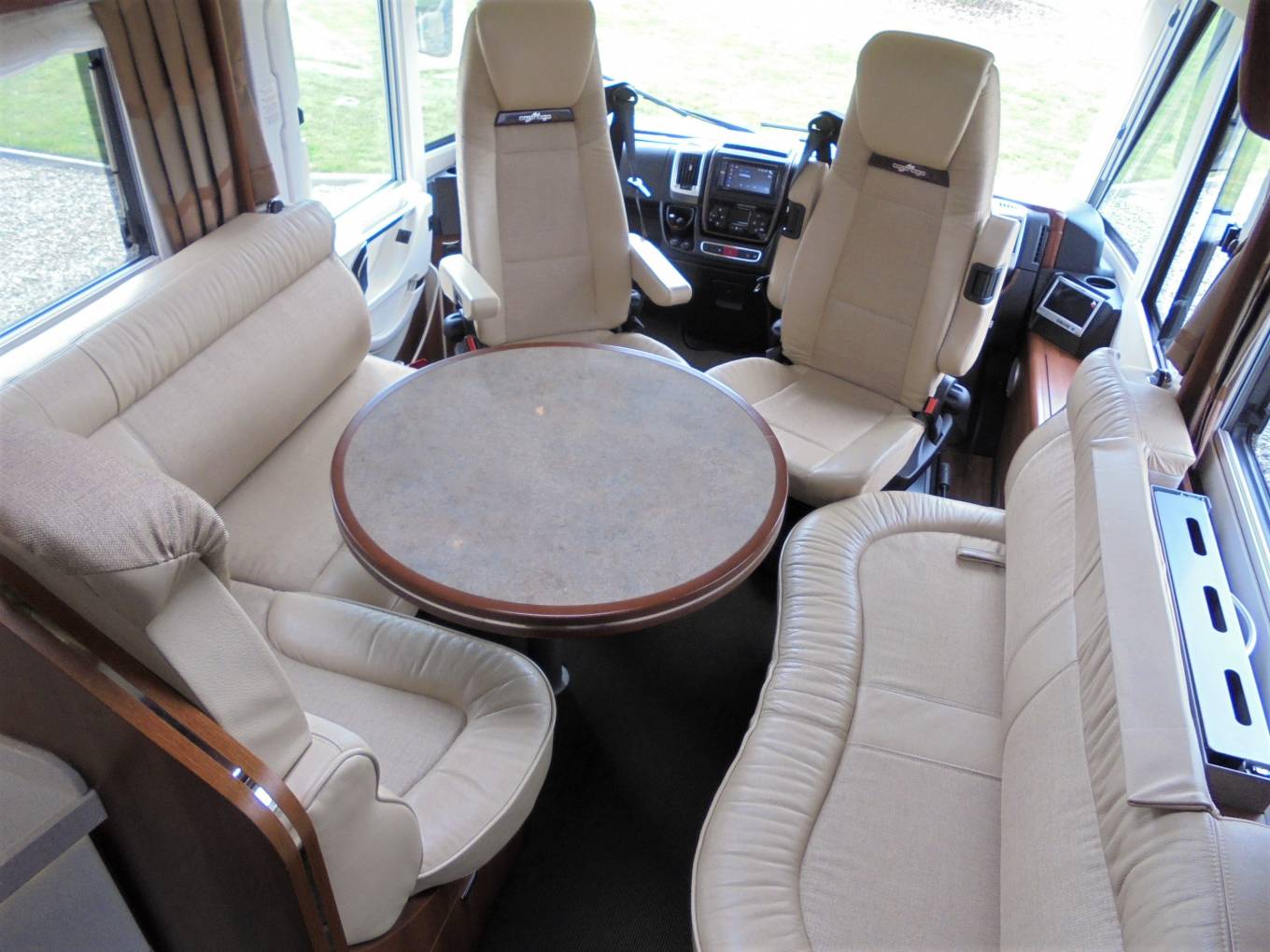The kitchen area has hob with 3x gas rings, sink, oven and grill combi, 160 litre fridge with separate freezer which operate on gas or electric, drop down coffee machine, wine rack, extractor fan and lots of storage. Heating and hot water are provided by an Alde system which operates on gas or electric and also by an Alde blown air heating system. The washroom has electric flush cassette toilet and sink. A separate shower room is opposite the washroom and has both rain fall and traditional shower heads. The motorhome has habitation area air-con, an elevating 22 inch Freeview TV which is connected to the media system, an internal aerial, 85cm satellite system, lounge speakers, LED spotlights and floor lighting, half leather upholstery, Carthago barometer, clock and hydrometer, Carthago glass cabinet with branded glasses and carpets throughout. Within the main bedroom is an island double bed which inclines for extra comfort. It also has external gas BBQ point, an additional Theford toilet cassette, electric hook up, 230v and 12v power points, retractable electric step, is winterised and fitted with a Gas-lo system with twin 11KG refillable bottles, 2x 100w solar panels, 1800 watt inverter, 3rd gel leisure battery and Thule awning canopy. At the rear is a large garage which is lined with aluminium chequer flooring, has power points, lighting, a shower point and cargo tie down points. The motorhome has optional silver livery, cruise control, ABS, ASR traction control, ESP, hill start assist, cab air-con, 360 degree fish eye reversing camera with dedicated monitor, CD, Radio, DVD and Sat Nav unit with auxiliary inputs, central locking for cab and external locker doors, cab swivel seats and is fitted with alloy wheels and has a full size spare wheel.