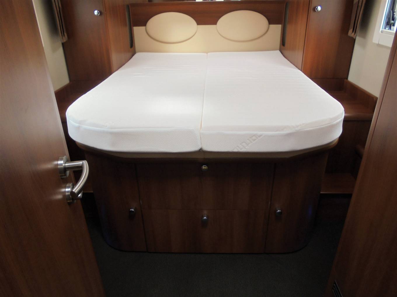 Built on an Alko chassis, the layout is front lounge and dining area with pull down bed above cab, central kitchen, central separate washroom and shower rooms, rear bedroom with fixed rear bed and large rear garage.