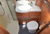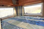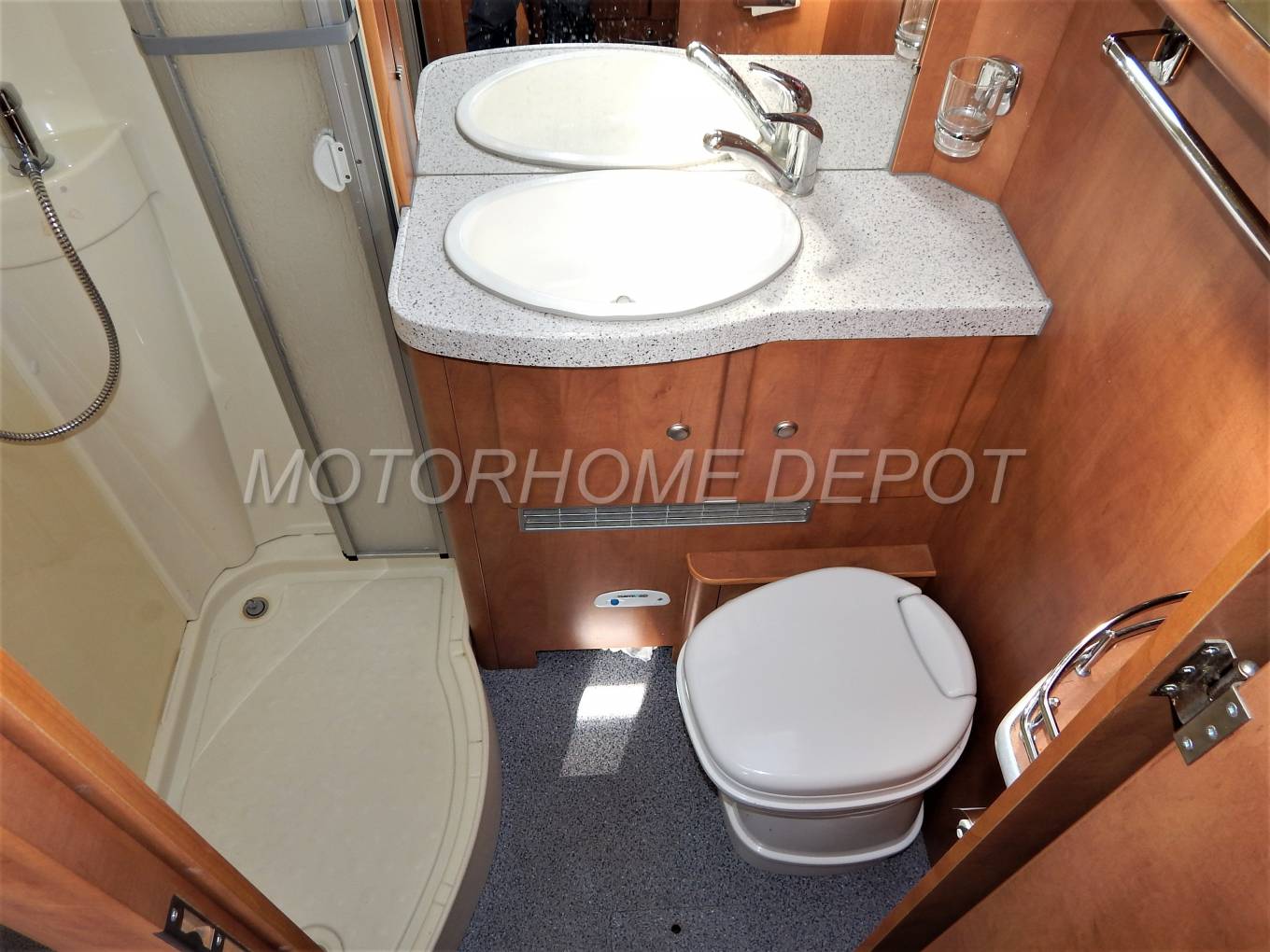 Moving rear again is the large all in one bathroom with separate shower cubicle that can be closed off with Perspex doors. The toilet is a cassette style Thetford fresh water flush with swivel head. There is a white sink above with chrome mixer tap. Plenty of cupboard space for all your grooming accessories.