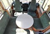 We enter the motorhome on the off side via a mechanical step immediately to the right of the habitation door is a single side sofa and opposite is the dinette with an L shaped sofa. The forward facing seats are travelling seats with 2 x 3 point lap & diagonal seat belts. The front two seats rotate to join this area. You could easily seat 6 people around the table if entertaining on site. The second of the two large double beds drops down from above the cab manually. It can be accessed via the small sofa. There is a TV point in the cupboard to the left of the habitation door.