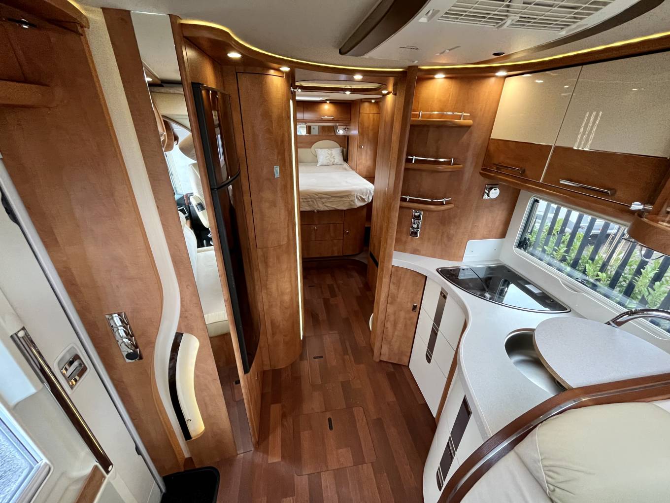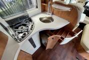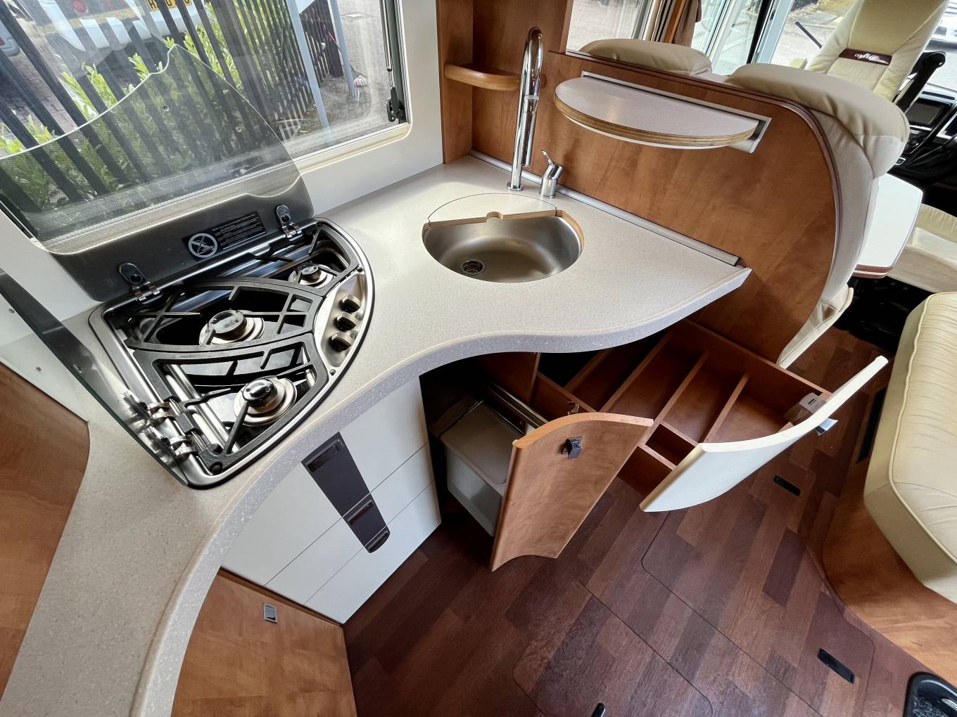 The front lounge incorporates all-round seating adorned in soft ivory leather. A great place to relax and enjoy panoramic views of your surroundings or watch some of your favourite TV programmes after a long day out. This open space joins neatly on to the kitchen, equipped with 3 x gas hobs for cooking, sink and tall fridge with separate freezer.