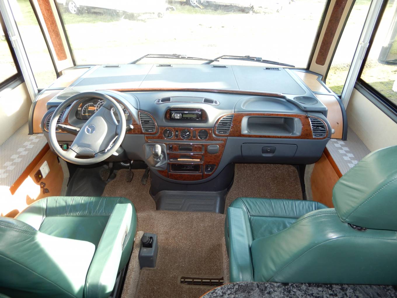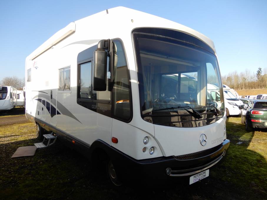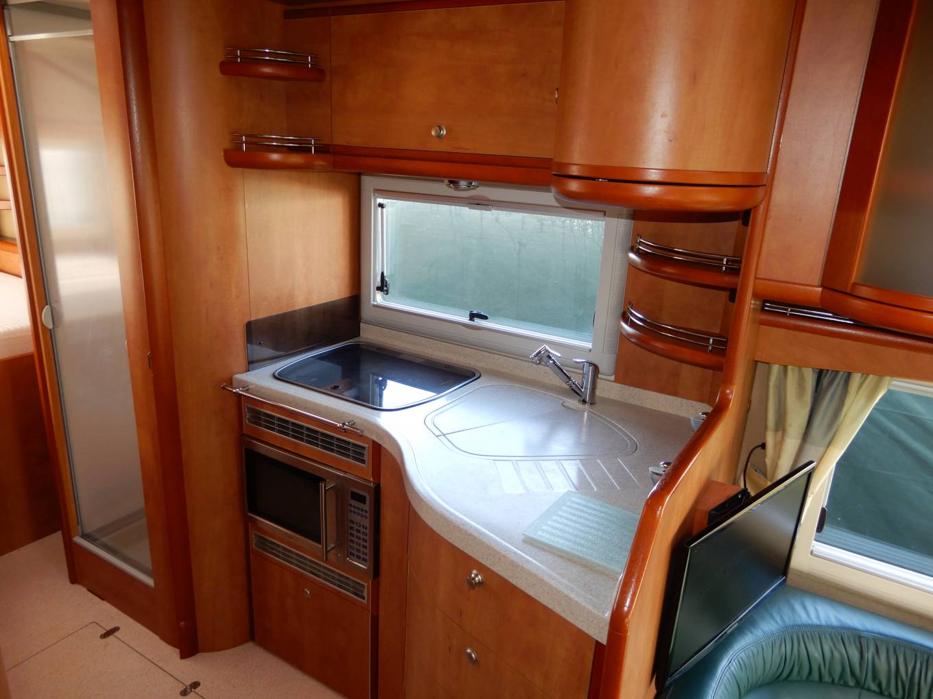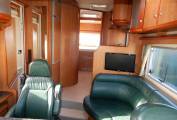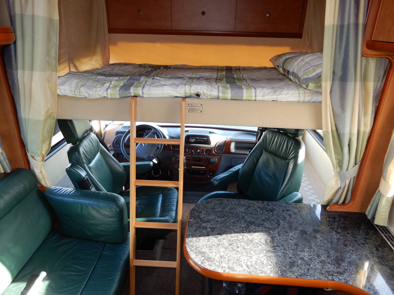 Here you have a Cathargo M liner 57 BRH, on a 2680 Mercedes, This is a 4 berth A class with 3 seat belts. the classic look of the Cathargo sells itself throughout this motorhome with the green leather interior and traditional woodwork. This left hand drive and large cab area gives you the feeling of freedom whilst driving, the wind screen has an electric blind also cab air con. Above the cab area is a drop down double bed with plenty of head room. The two front seats turn to the dining area where there is a forward facing seat with a seat belt and a bench at the side, the table extends to create plenty of dining area and a great place to spend family time with the TV. The habitation area has air con, and plenty of space. the kitchen area has a Combination oven, 3 Gas burner hob and a sink with a mixer tap also a Full fridge and separate freezer.. The large washroom has a sink mixer tap and toilet with plenty of room to move also plenty of storage. Across the hall is a separate shower cubicle. The large raised double bed at the back allows there to be a large garage underneath which is accessible from the outside. The garage is large enough for a moped that is an optional extra.This motorhome has a ladder for roof access and has solar panel.