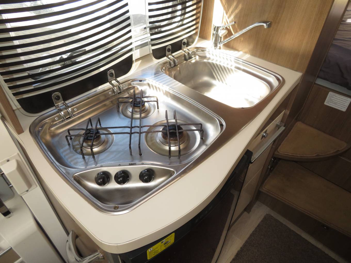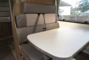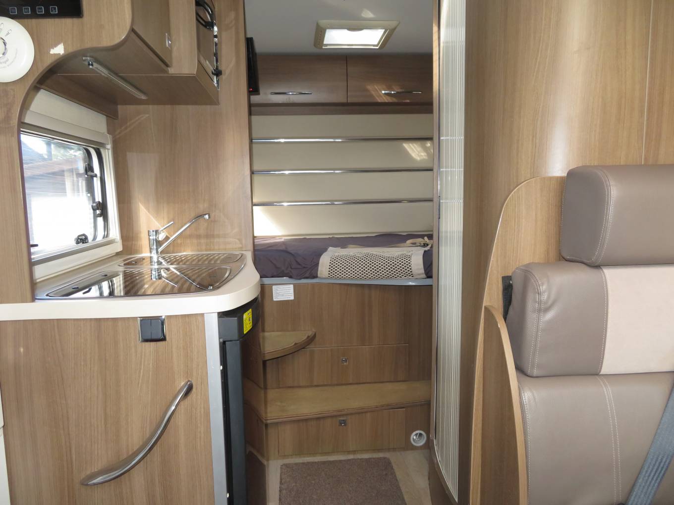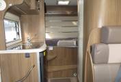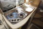 The 514 has a fantastic layout for a 6 metre motorhome. The front offers a great place to sit down and relax with 2 captains chairs, a 2 seat sofa and a separate single seat. It also has a multi-directional table where you can enjoy a snack, meal. The motorhome comes with a well equipped kitchen including hob with 3 gas burners, grill, sink with mixer tap and automatic 3-way fridge with freezer compartment.